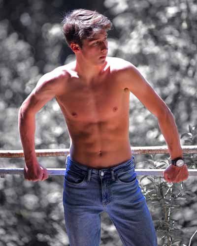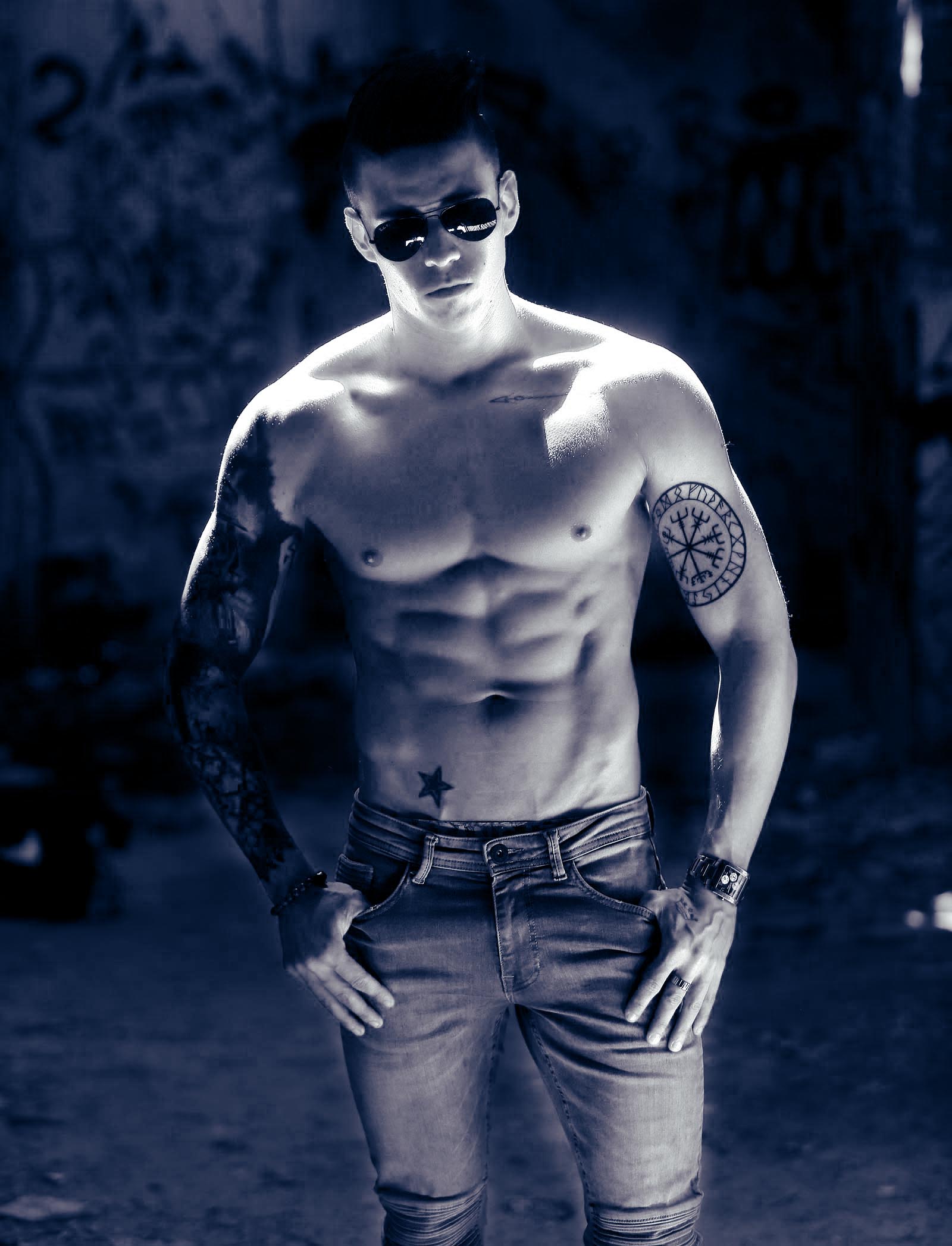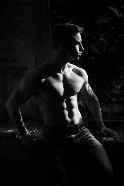 Fitness modellen nemen vaak foto's in sportzalen die een specifieke lichtopstelling hebben (verticale lichtstralen). Hier gaan we ongeveer hetzelfde doen, maar met de lichtstralen die van beneden komen. Het effekt is gelijkaardig, maar we hebben het voordeel dat het gezicht van het model goed belicht is, wat niet het geval is als het licht vertikaal van boven komt. Zelfs weinig gespierde modellen hebben nu een sixpack gekregen (vierde foto rechts).