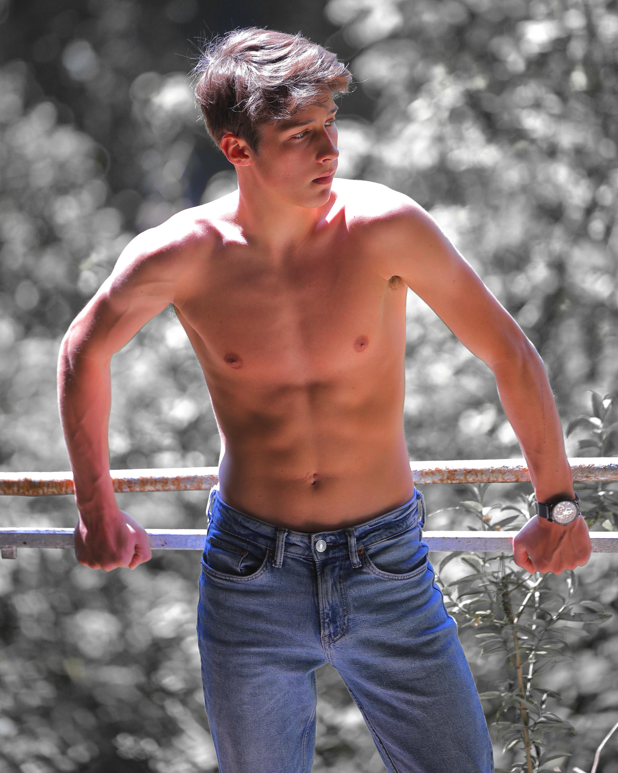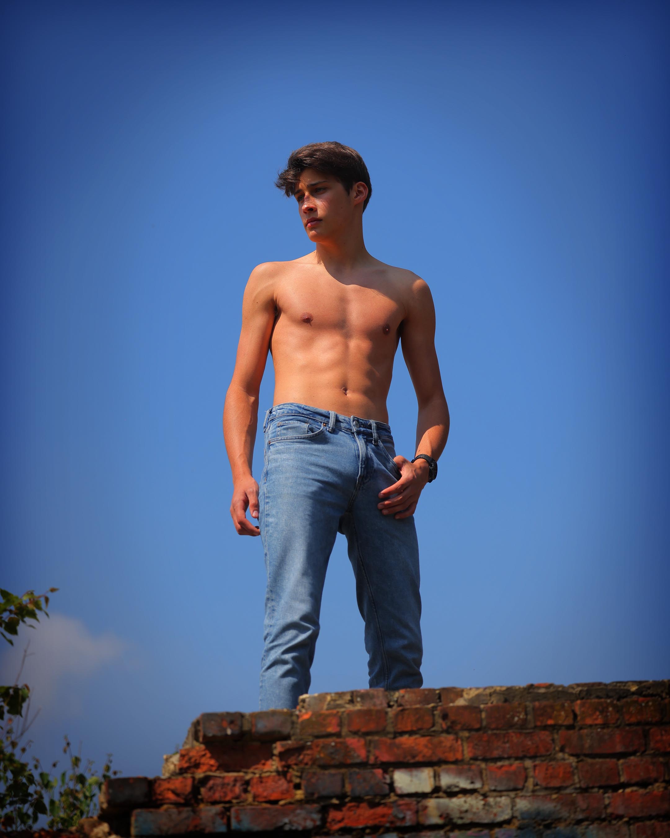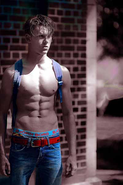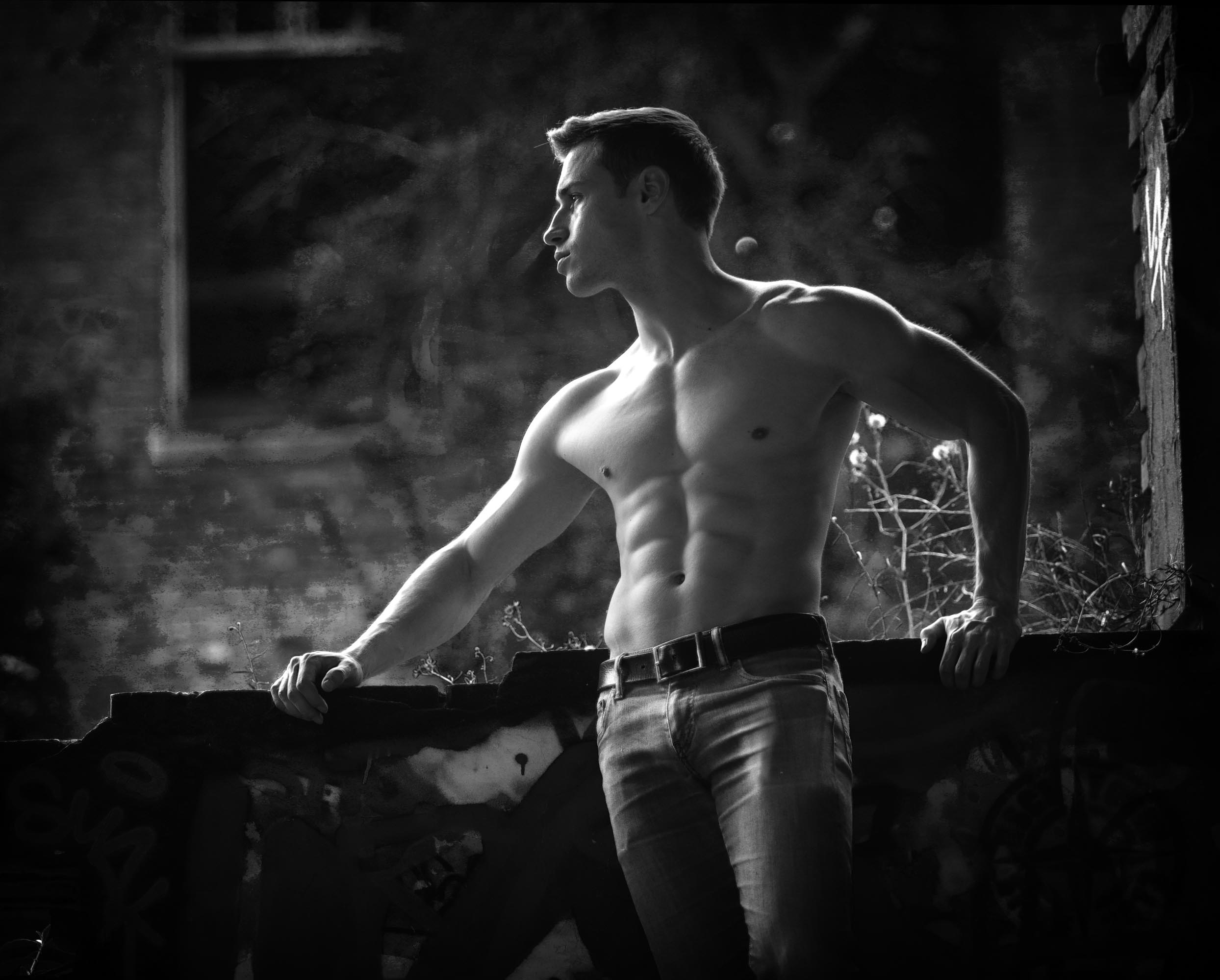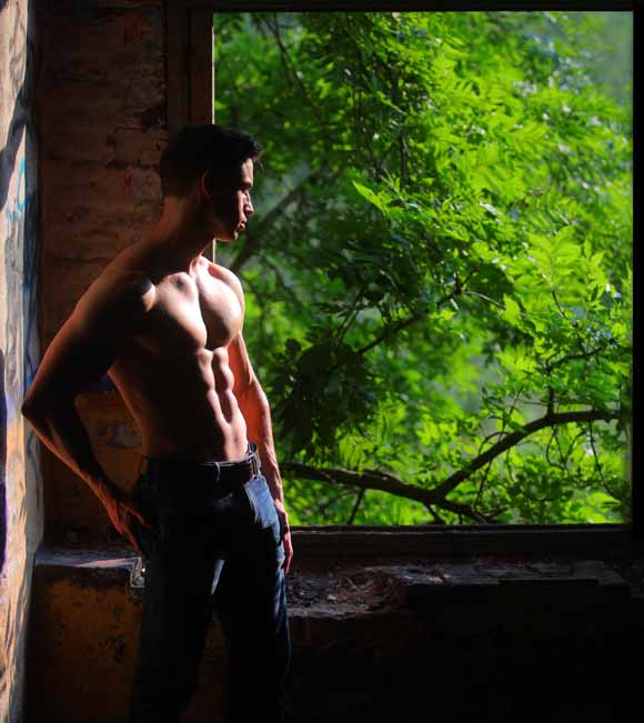 Là où il y avait des fenètres il y a maintenant de grandes ouvertures béantes qui laissent pénétrer la lumière. C'est l'endroit idéal pour profiter du jeu de l'ombre et de la lumière. Mais cela ne veut pas dire qu'il faut placer le modèle en plein soleil: sauf dans certains cas bien particuliers, cela ne donne pas un bel effet, mais plutot des images de vacances. Ce n'est que sur la dernière photo à droite que l'effet du plein soleil sur un modèle est réussi. Het heeft dan ook weinig zin een fotoshoot in het fort te organiseren als er geen zon is: hoe meer zon, hoe beter. Als er weinig zon is krijgen de modellen een groezelig tintje door het groen van de bomen. In de zomer is het trouwens lekker fris in het fort. Cela n'a que peu d'intérêt d'organiser un shooting avec des modèles quand il n'y a pas de soleil: plus il y a du soleil, meilleures seront les photos. Quand il n'y a pas de soleil, les modèles ont le teint livide à cause de la végétation très présente sur le site. Même en plein été il fait relativement frais au fort. Pour de belles photos il est recommandé d'utiliser la lumière indirecte qui frappe les murs ou le sol. Le sol occre ajoute de la chaleur aux photos. Les modèles musclés prennent souvent des photos dans les salles de fitness qui ont un éclairage vertical très marqué. Ici on va faire la même chose, mais avec un éclairage qui vient du sol. L'effet est similaire, mais on a l'avantage que le visage du modèle est bien éclairé, ce qui n'est pas le cas avec de la lumière qui vient de haut. Même les modèles pas très musclés ont maintenant un sixpack.