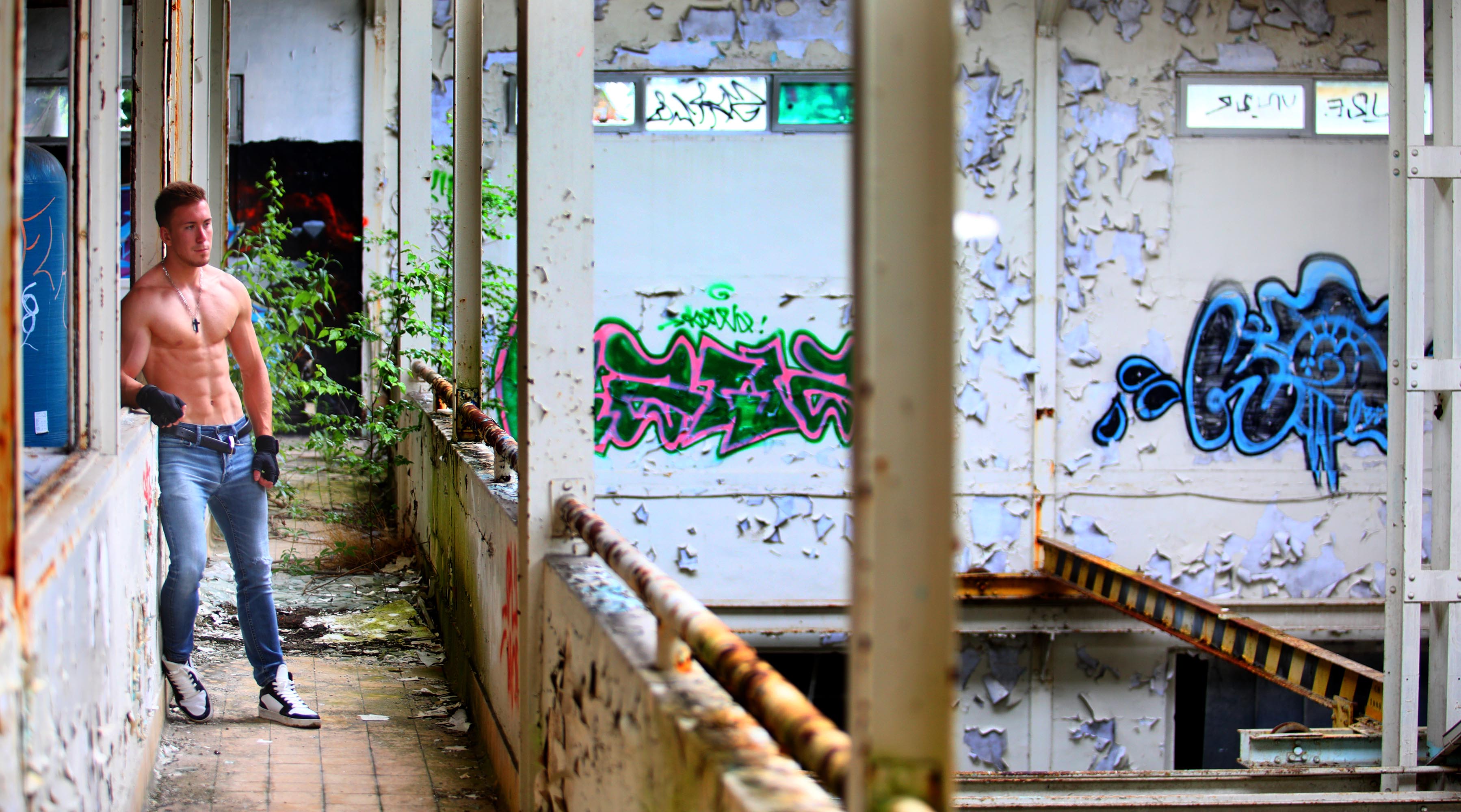 Op het verdiep van het hoofdgebouw De site werd een paar jaren geleden gebruikt voor illegale rave parties, waardoor de boel nu afgesloten is door zware betonblokken zodat vrachtwagens niet meer binnen kunnen, maar als voetganger kan je nog altijd binnen. De fabriek heeft geen huisnummer meer en je moet eigenlijk de baan volgen tot je naast de weg de gebouwen tegenkomt tussen de begroeing. Voor ik een fotoshoot met modellen ter plaatse doe, ga ik de plaats verkennen om na te gaan wat er allemaal te zien is en of het wel voldoende veilig is. Dit is het verslag van mijn bezoek aan Spontin. Er zijn verschillende interessante plaatsen op de site: het hoofdgebouw met tags aan de muren en met een mooie lichtinval (als er zon is). Daar kan je de muurschildering met de doodskop vinden. Je kan ook naar de bovenverdiepingen gaan waar je dan zicht hebt op de loodsen. De bouw is nog stevig en er is normaal geen kans dat je door de vloer zakt. De villa's aan de zijkant zijn sterk verloederd en de vloeren zijn niet echt stevig meer. Dit is vooral het geval op de balcons. Ik zou daar niet meer gaan, maar enkel de villa's als achtergrond gebruiken. Onder de villas waren er installaties voor het aftappen van de bron. De meeste ruimtes zijn hier leeg. Naast het hoofdgebouw is er de stookplaats. Toen we begin juli langsgeweest zijn had het een maand lang geregend en de plaats was niet meer zo geschikt door de weelderige begroeing. De waterzuiveringsinstallatie ernaast was zelfs volledig onbruikbaar. Je kon er wel nog geraken, maar je had geen zicht meer op de installaties zelf. En na de shooting in Spontin kan je verder rijden naar Durnal, een treinstation waar er oude gerestaureerde treinstellen staan opgesteld. Er is ook een toeristische trein die in de zomermaanden op de sporen rijd. Je kan de sporen volgen (andere kant van de tunnel) of een klein baatje volgen (rue de Chansin) tot in Durnal. Begin 2021 heeft een investeerder een deel van de site gekocht (het hoofdgebouw met de waterafname), maar halverwege 2021 is daar nog niets van te zien, behalve een paar nieuwe borden 'verboden toegang'. De investeerder zou wachten totdat hij het volledig terrein kan kopen. Hij zou opnieuw iets doen met het water van Spontin. Op het verdiep van het hoofdgebouw