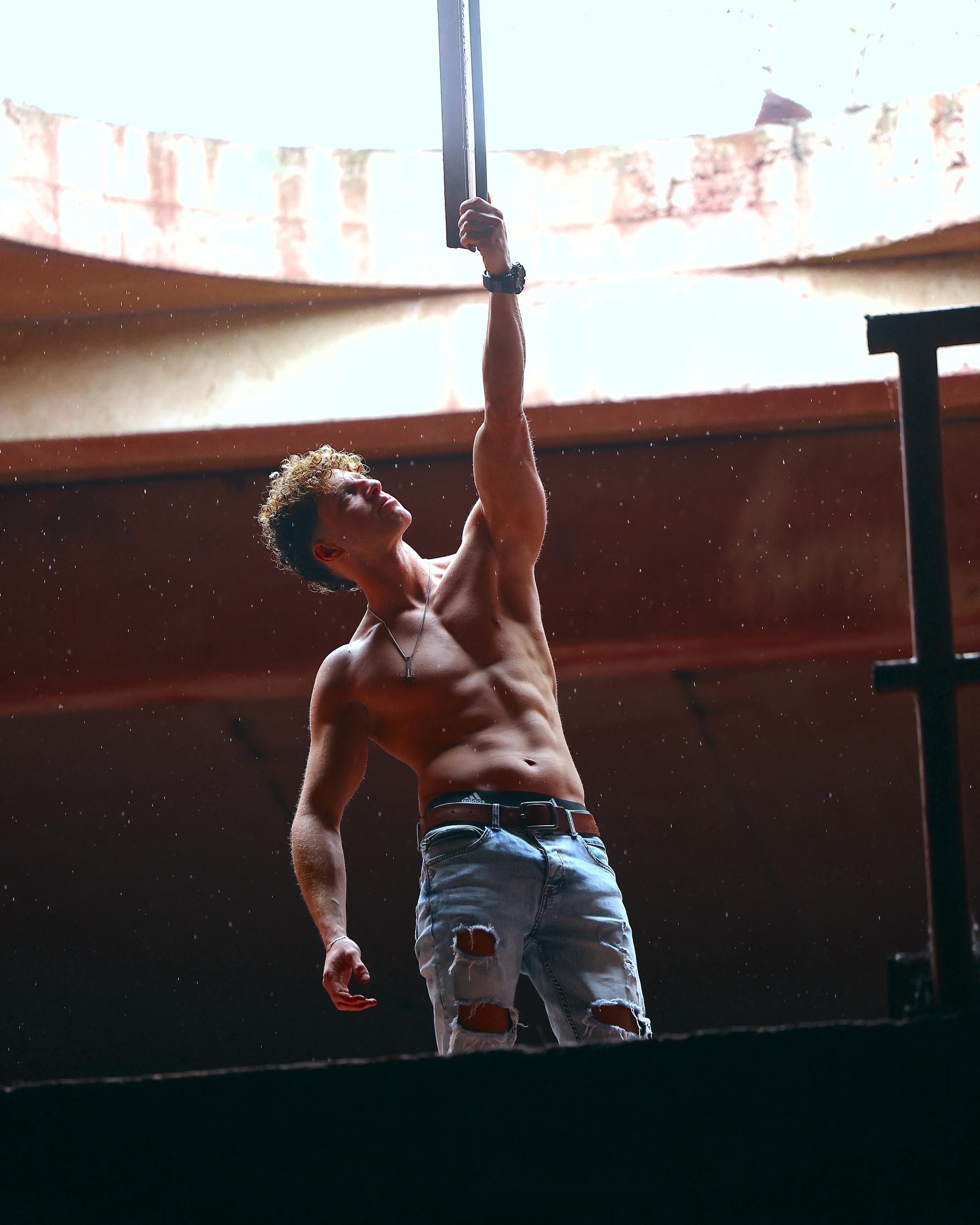 In de "Rode Kamer" had ik mooi zacht invallend licht (fitness style). Tijdens de shooting begon het zelfs te regenen, je ziet de regendruppels op de achtergrond op bepaalde foto's. De modellen zelf werden zodanig geplaatst dat ze niet nat werden. Je bent van de regen en de wind beschermd op de meeste plaatsen van het gebouw, maar het is niet het geval overal. Het kan koud zijn als er wind is: de wind trekt door bepaalde ruimtes omdat er geen ramen meer zijn. Het is een lokatie die te bezoeken is als de temperaturen aangenaam zijn. Wat heel slecht werkt op deze locatie is veranderlijk weer. Soms komt de zon erdoor en loop ik naar het zwembad, als ik het model op de juiste plaats gezet heb en mijn fototoestel ingesteld heb verdwijnt de zon achter de wolken en zijn de foto's niet goed. Ik loop dan snel naar de rode kamer, maar dan is er plots opnieuw zon en weer zijn de foto's niet zo goed. In de rode kamer kan je enkel goede foto's met felle zon nemen op bepaalde tijdstippen van de dag, als de zon op een aantal specifieke plaatsen schijnt. Cette page fait suite à la page consacrée aux shootings à la décaperie. Ces shootings ont été prévus par beau temps. Mais j'avais également un shooting organisé pendant les shooting days. C'est dommage qu'il ne faisait pas beau (il s'est même mis à pleuvoir pendant le shooting), mais la date ne pouvait plus être modifiée.