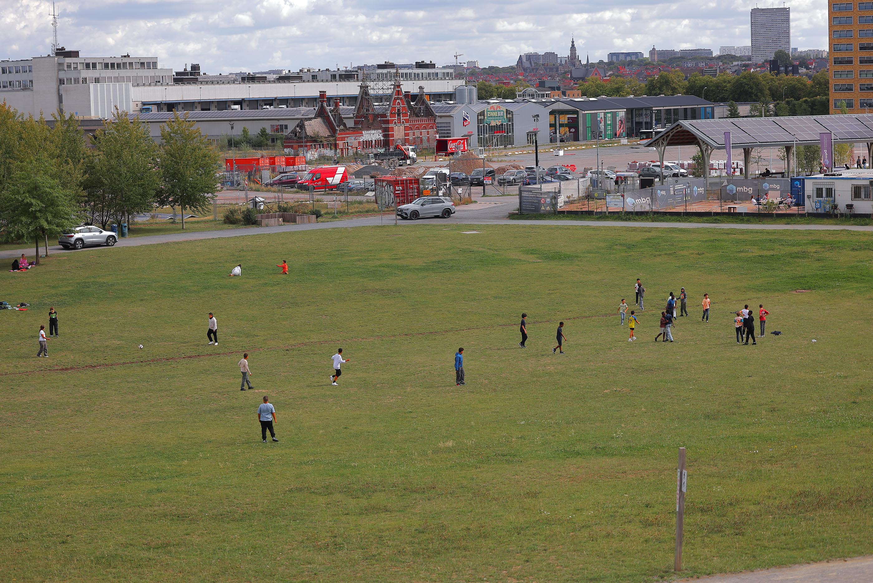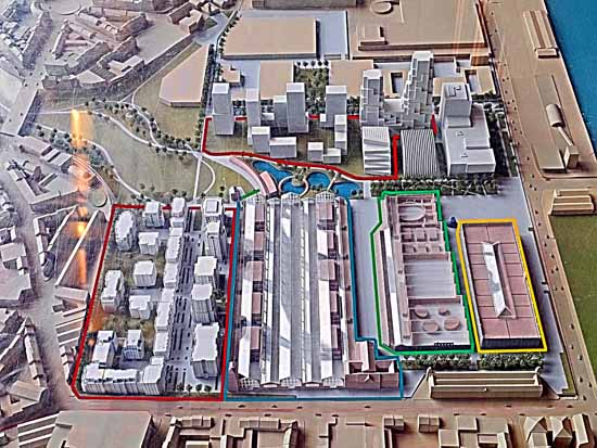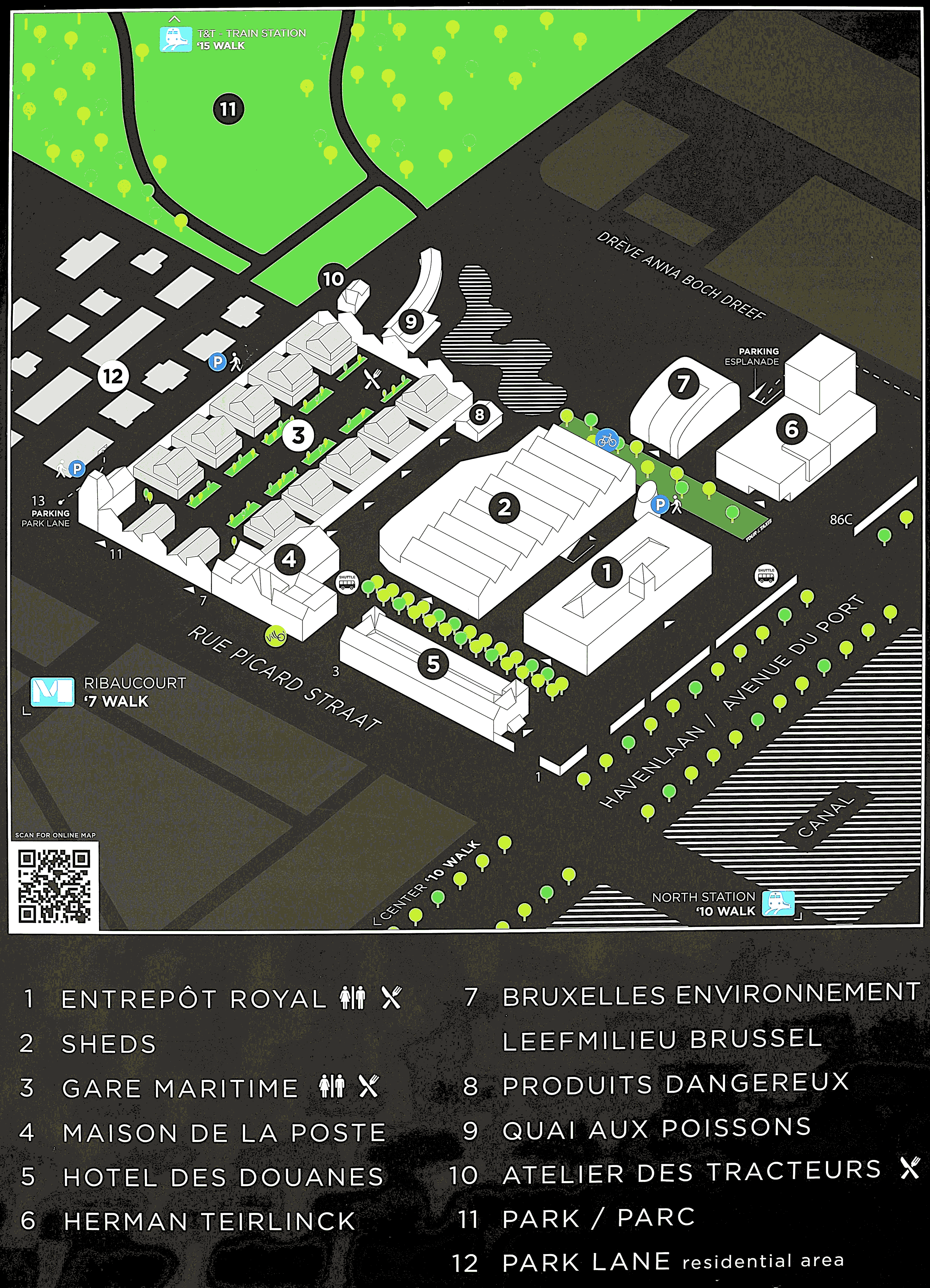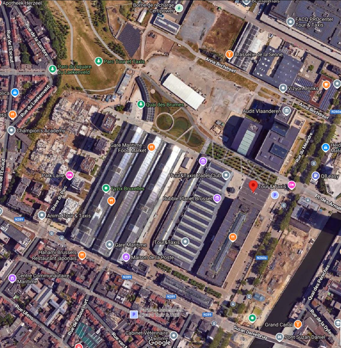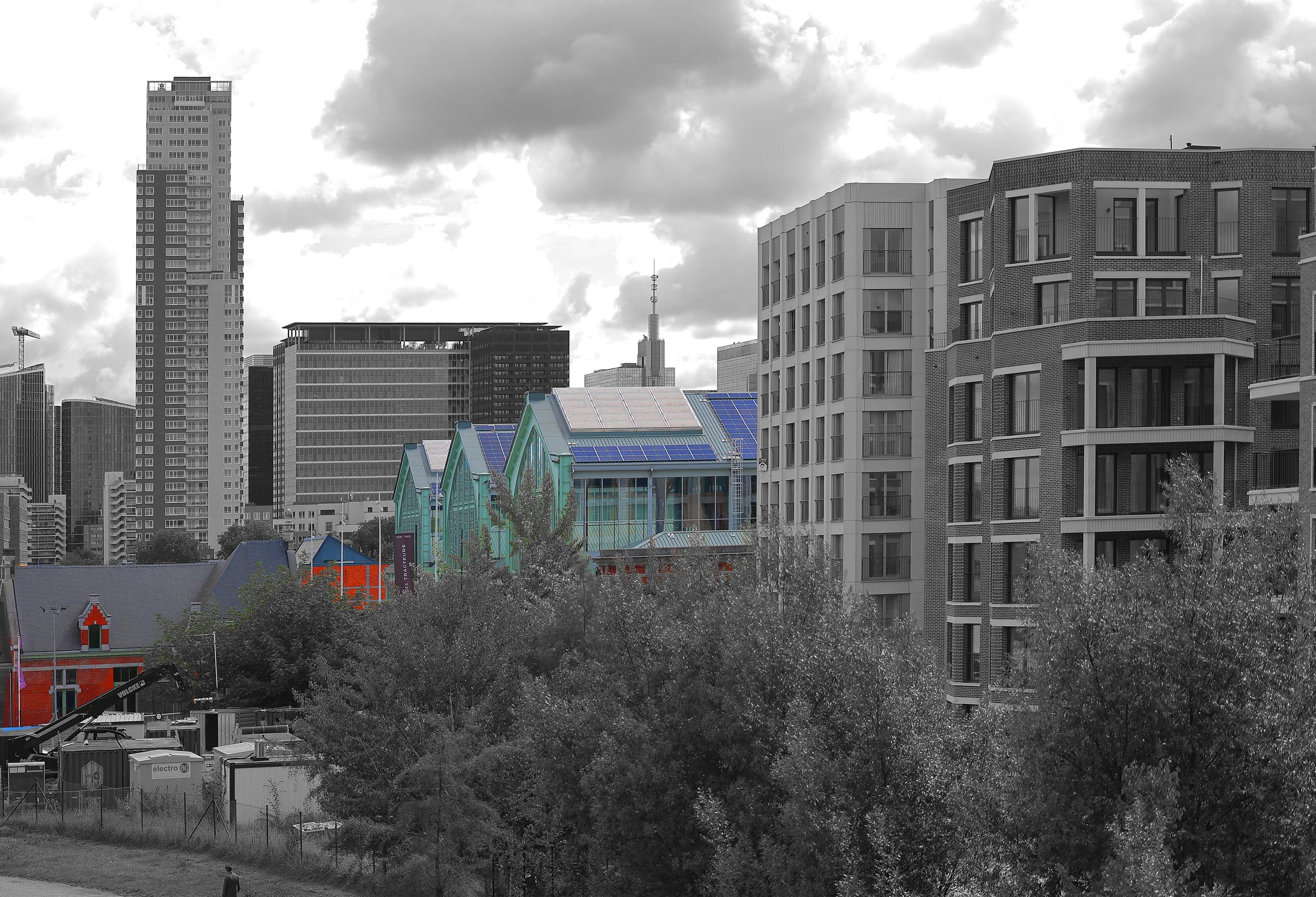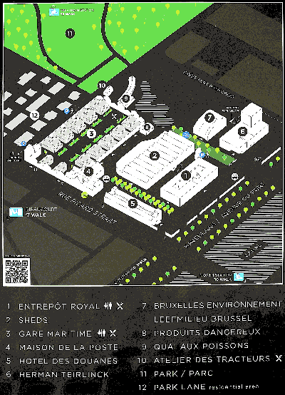 Er zijn nog andere gewouwen op de site, maar die horen niet bij de historische gebouwen: het gebouw van Brussels Environment en de kantoren van de Vlaamse regering. Er is ook een brouwerij op de site (Brasserie de la Senne), het verhuisde van Molenbeek Sint Jan naar hier. Voorbij het maritiem station is er nieuwbouw: het zijn allemaal appartementen. Het verste gedeelte van de voormalige Thurn und Taxis (het gedeelte aan de Jubelfeestlaan) is nu ingericht als park, het zou één van de grootse parken van Brussel moeten worden. Thurn und Taxis was oorspronkelijk een goederenstation; het werd een "maritiem station" genoemd vanwege de verbinding met de zee via het kanaal en de haven van Antwerpen. Alle goederen die voor Brussel bestemd waren werden hier gelost, maar ook de goederen voor Charleroi werden hier tijdelijk opgeslagen. De spoorlijnen werden verwijderd (behalve die in het koninklijk pakhuis) en het rangeerstation werd omgevormd tot een park dat zich uitstrekt tot voorbij de Jubelfeestlaan, tot aan spoorlijn 28. De oorspronkelijke gebouwen werden gerestaureerd, maar er werden ook een groot aantal appartementen gebouwd (wat het project winstgevend maakt). De originele gebouwen hebben hun kleuren behouden, de rest van de afbeelding is monochroom gemaakt. Je ziet dat de originele gebouwen, hoewel indrukwekkend van dichtbij, niet veel voorstellen. |