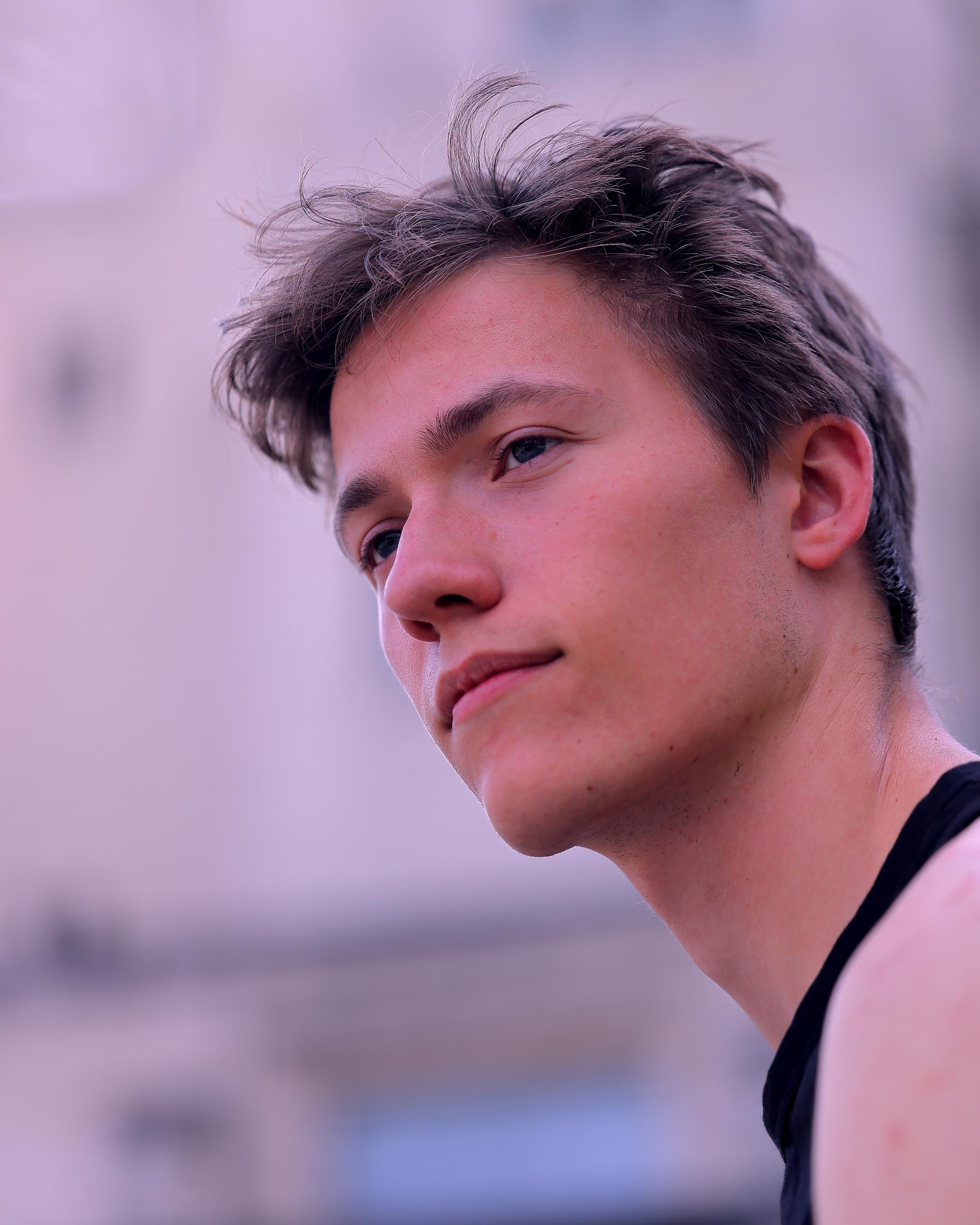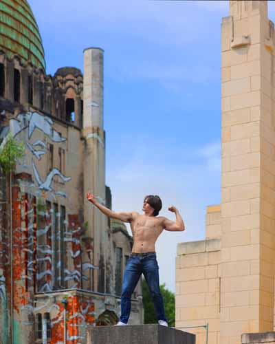 Wednesday: mémorial InteralliéWednesday is the first day that we actually organize shootings. We go to Mémorial Interallié not far from the railroad station Liège Guillemins, because during the day a few models will arrive by train. It is not my favorite place, I prefer a place with sun and shade.Photo right: a fitness model must of course show his skills, followed by a second model a little later. In the background the church Sacré Cœur of Liège. A model from the Netherlands came to Liège for a short photoshoot for just one day. In the morning I try to contact him, but no response to the messages and the phone calls. Probably not awake in time and missed the train. I start my shootings with another model.