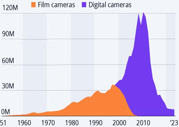 Un simple graphique en dit long sur l'évolution des ventes d'appareil photo. On voit que la vente d'appareils argentiques a chuté à partir des années 2000 avec l'apparition des appareils numériques. On a eu un pic dans les ventes dans les années 2010 avec plus de 120 millions d'appareils vendus par an. Mais on voit maintenant le même effet avec les appareils numériques, remplacés par les smartphones.