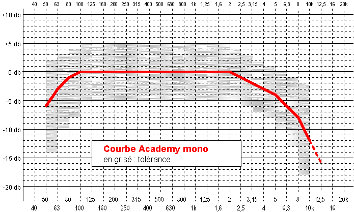Il s'agit de la bande passante qui doit être reproduite au cinéma. Les fréquences extrèmes sont filtrées à l'enregistrement et à nouveau à la reproduction, non pas parce qu'elles ne peuvent pas être reproduites, mais parce qu'elles produisent trop de distorsions. Elles sont filtrées à l'enreg>