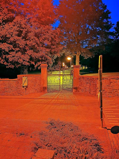 L'avant plan (la rue) est éclairé par des lampes sodium basse pression, tandis que l'arrière plan (le parc) est éclairé par des lampes sodium haute pression.