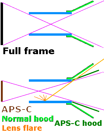L'image montre le champ de vision d'un appareil à capteur de taille normale et à taille réduite. Dans le cas de l'appareil APS-C la source de lumière intense n'est pas visible, mais par contre les flares (effet indirect) peuvent influencer négativement la qualité des images. Les flares sont des reflets sur les parties internes de l'optique.