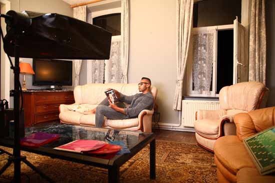 Les photos sont prises le soir, pour éviter la lumière externe. La scène est éclairée par deux flashes, un flash direct (softbox allongé) sans filtre coloré et un flash avec bol sur lequel est monté un filtre. Ce flash n'est pas directement visible sur l'image ci-dessus, mais on voit l'effet sur l'écran de télévision. Il s'agit sur la photo ci dessus d'un filtre jaune. Le filtre coloré est dirigé vers le plafond pour donner une ambiance générale. L'effet est principalement visible dans les ombres du flash principal car sa lumière est atténuée par la réflection sur le plafond.