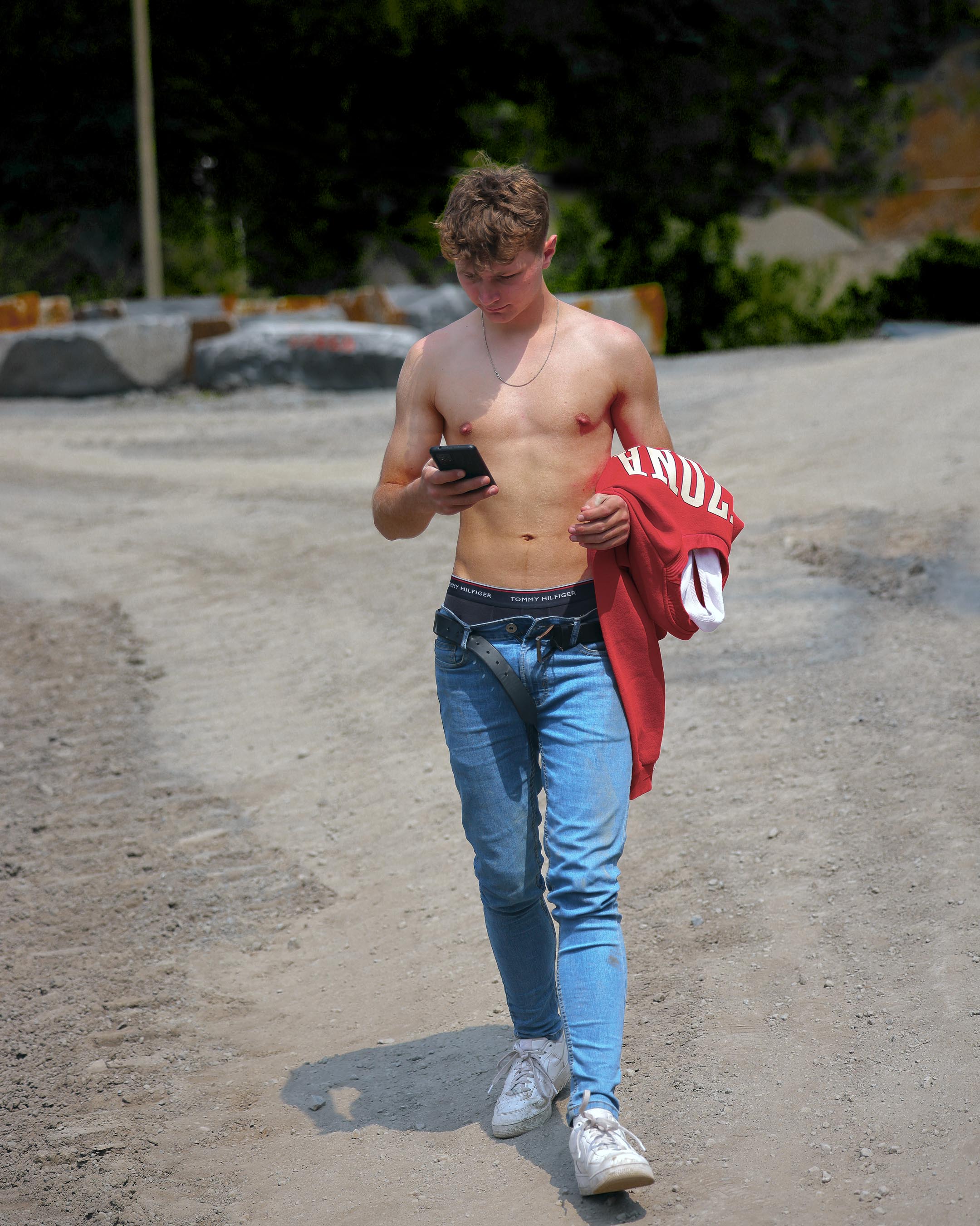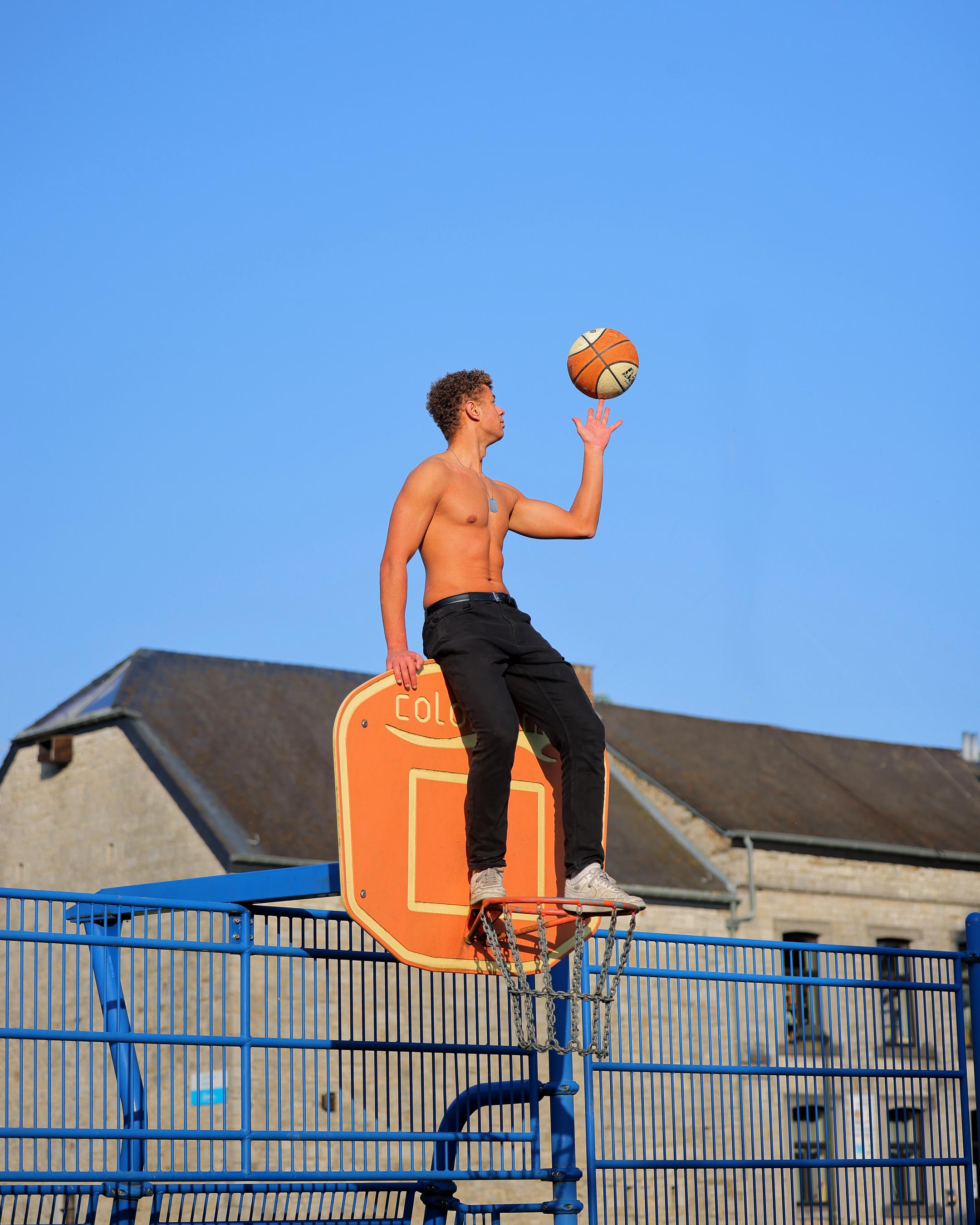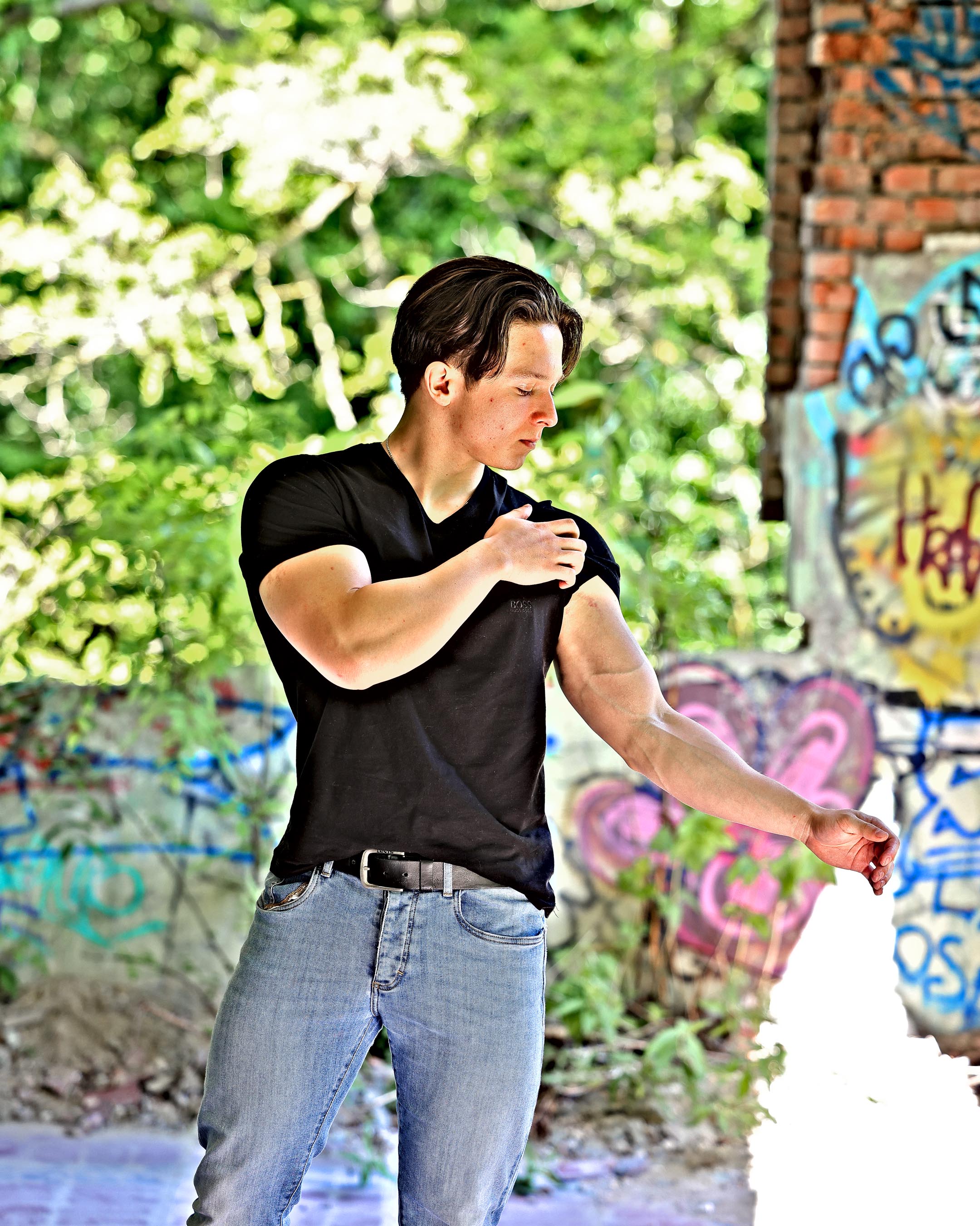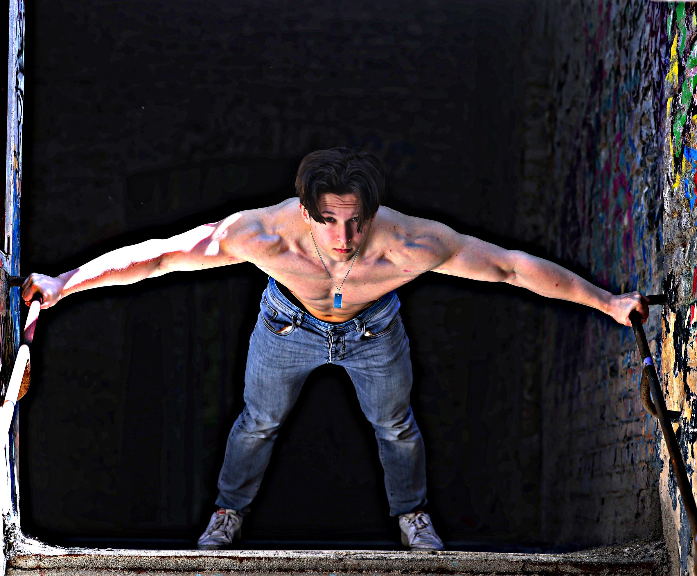 Deux modèles du concours Best Model for Belgium étaient présents, mais ils n'avaient que des vêtements noirs, ce qui ne fonctionne pas bien à cet endroit qui est fort sombre. C'est de plus un endroit typiquement post-industriel (urbex) où le fashion ne marche pas très bien. J'essaie toujours de trouver des endroits typiques où on peut explorer un thème donné. Pour du fashion, il y a le jardin de la maison et les terrains de sport en face de la maison.