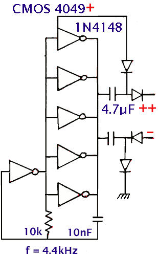 Si on utilise un 4049 avec sortie "buffered" CD4049BE le convertisseur peut fournir un courant continu de 20mA au lieu de 10mA. La consommation propre du convertisseur est très basse, de l'ordre de 2mA. C'est le circuit le plus facile à utiliser. La tension obtenue dépend de la charge et de la tension d'alimentation, elle est de 22V pour une tension d'alimentation de 12V et une charge de 2.5mA.