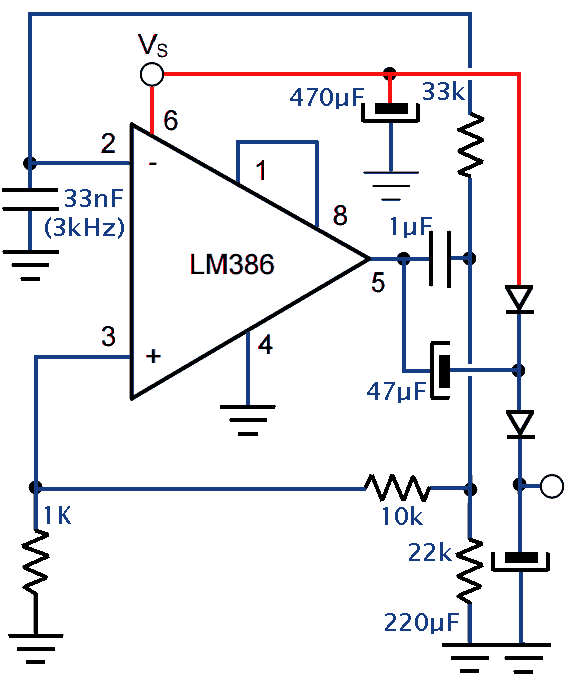 Le LM386 est à l'origine un petit amplificateur audio qui peut fournir une puissance de 250mW, on l'utilise ici comme oscillateur astable (multivibrateur). La tension d'alimentation maximale est de 15V.