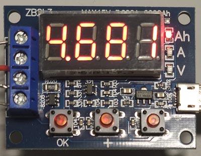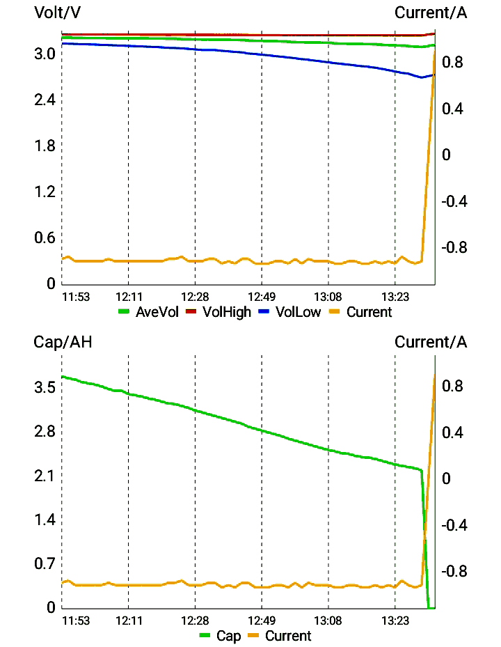 Le second graphique est pris en fin de décharge (et au début de la recharge). La décharge est coupée alors que l'accu a encore une capacité de 12% sur l'afficheur. La capacité résiduelle passe brusquement de 2.1Ah à 0Ah, et quand la charge recommence la capacité indiquée remonte directement à 4Ah. La mesure semble être faite à partir de la tension totale de l'accu.