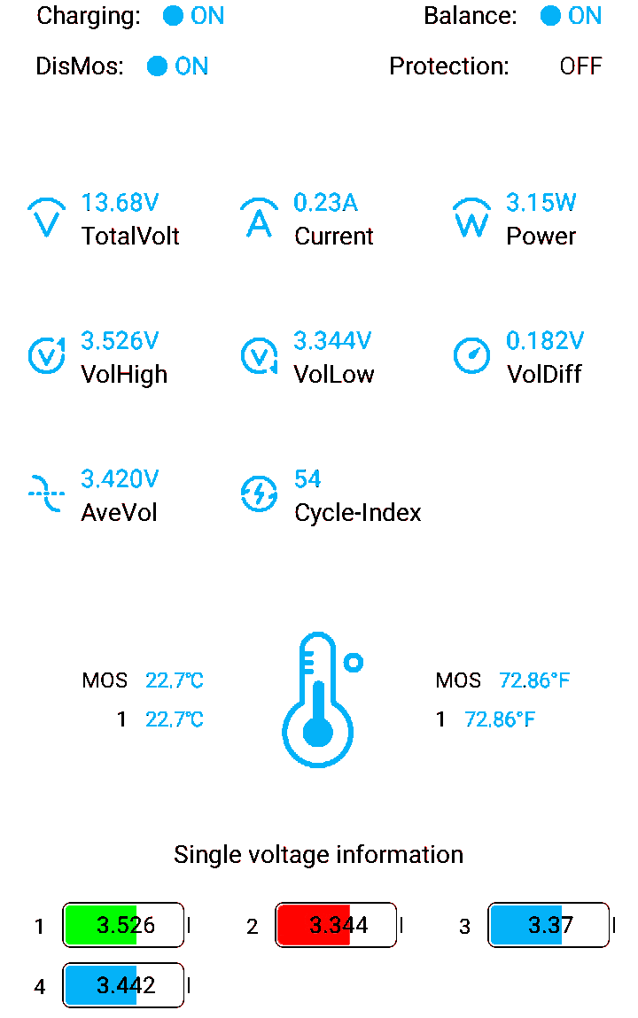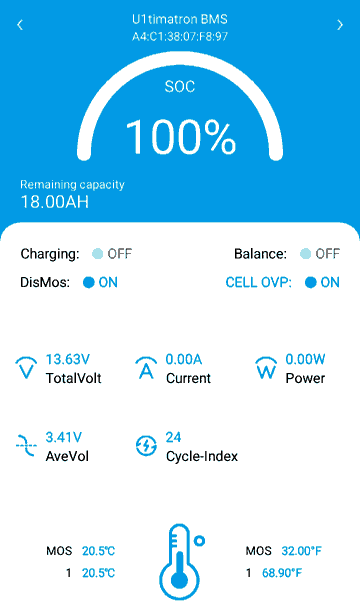 J'ai à nouveau fait une mesure de la capacité après plus de 100 cycles complets (indiqués dans l'application): la capacité est maintenant de 17.96Ah! La mesure a été effectuée en septembre 2025 après que l'accu a été utilisé pendant plusieurs mois comme accu sur mon réseau 12V alimenté par panneaux solaires. La charge était d'environ 60 à 100% avec la plupart du temps une charge entre 98 et 100%, ce qui permet un équilibrage permanent (sauf quand le frigo se met en marche). La mesure de la capacité sera confirmée en septembre 2025.