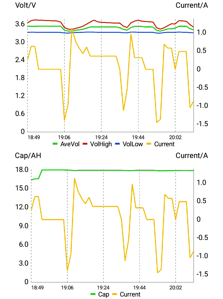 Après un second cycle de recharge-décharge complet l'accu indique une capacité de 0% et 0.00Ah quand l'accu a débité 17.6Ah, mais la décharge continue jusqu'à 18Ah. Ce cycle de charge-décharge est nécessaire pour recalibrer l'indication de charge de l'accu (accus avec module bluetooth uniquement). Dans certains cas ce cycle complet peut également raviver les accus qui sont un peu défaillants, mais cela n'est pas le cas ici.