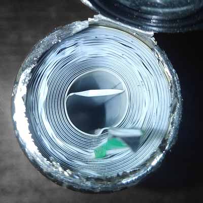 L'avantage des éléments cylindriques par rapport aux éléments sous forme de sachets rectangulaires, c'est qu'il y a une pression sur les électrodes et l'électrolyte pour assurer un bon contact. Ici il y a du jeu entre chaque couche et la batterie est devenue mauvaise au bout de quelques années (maximum 100 cycles). Un bon accu cylindrique a un cœur en dur sur lequel on bobine les couches serrées. L'accu est ensuite forcé dans un conteneur cylindrique qui garantit que la pression sur l'élément est toujours présente.
