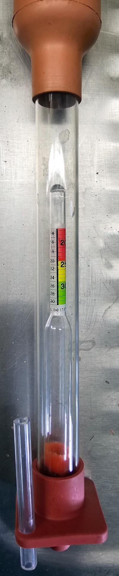A droite un pèse-acide qui permet de déterminer la concentration en acide de chaque élément de la batterie et donc de déterminer l'état de charge. La concentration de l'acide diminue à la décharge. L'échelle est en degrés Beaumé et une batterie chargée a une concentration de 28°Bé. Avec la pipette et la poire on prélève une petite quantité d'acide sulfurique pour faire flotter l'indicateur dans le tube.