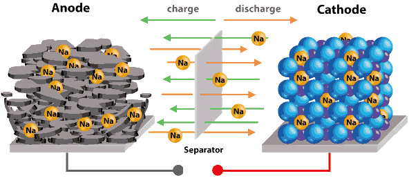 La cathode (le pôle positif) de l'accu se compose d'oxides métalliques permettant l'insertion des ions sodium. Ce ne sont pas les mêmes éléments chimiques que dans le cas d'accus au lithium dont les ions sont plus petits. Plusieurs compositions sont possibles, ayant des caractéristiques différentes. Pour l'anode, on utilise généralement du carbone dur. L'électrolyte est un sel de sodium.