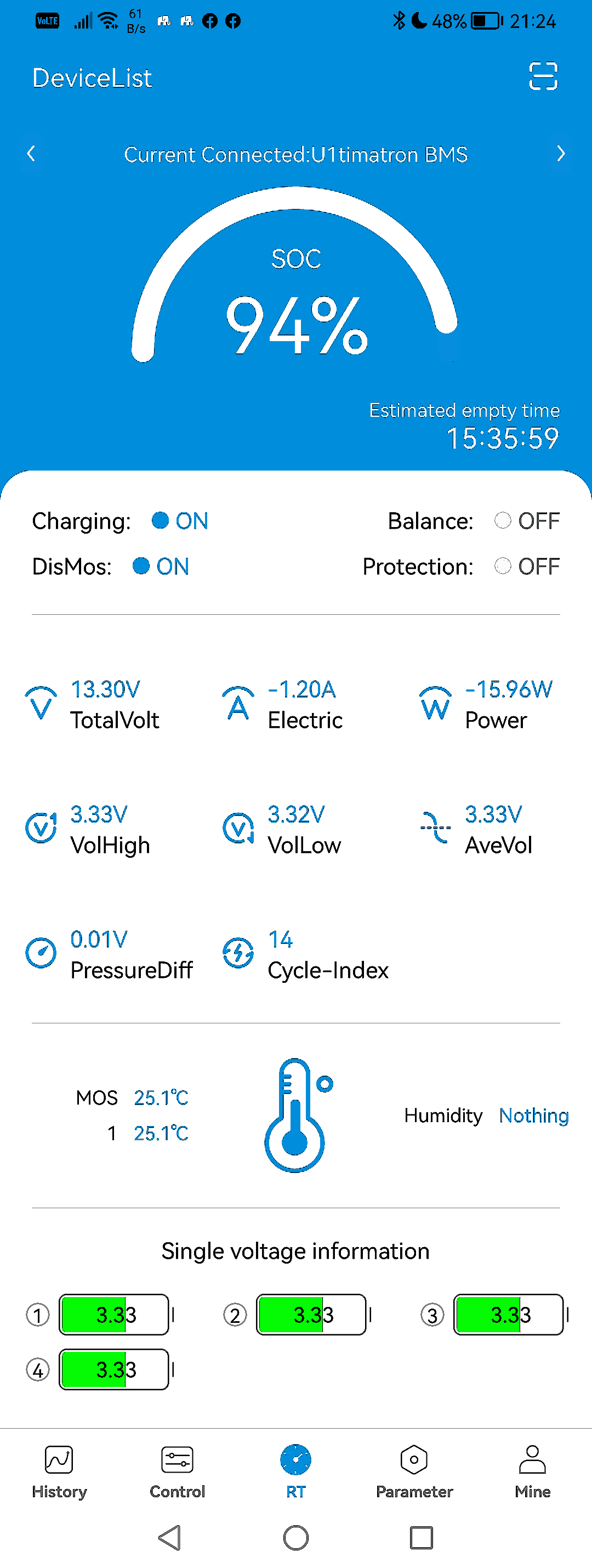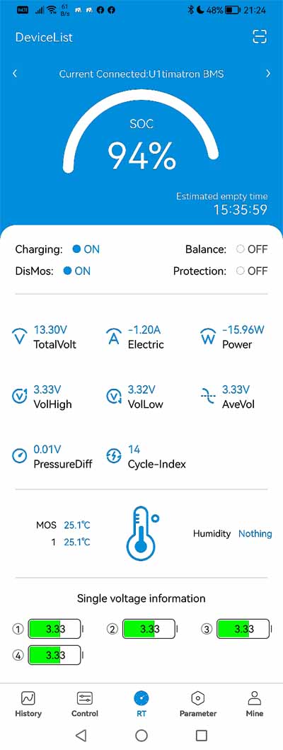Les indications montrées ici sont les indications de base, qui sont visibles même si on ne s'est pas enregistré (dans une nouvelle mise à jour l'historique a disparu). Si vous vous enregistrez avec votre adresse mail, vous devenez non seulement membre du parti communiste chinois, mais vous avez également accès à d'autres fonctionalités. L'historique est à nouveau visible, mais l'application montre plus de détails et permet même de modifier les paramètres de fonctionnement de l'accu. Voici la suite de l'article.