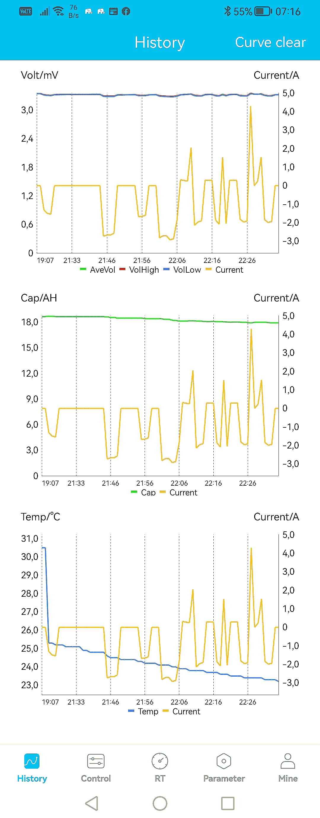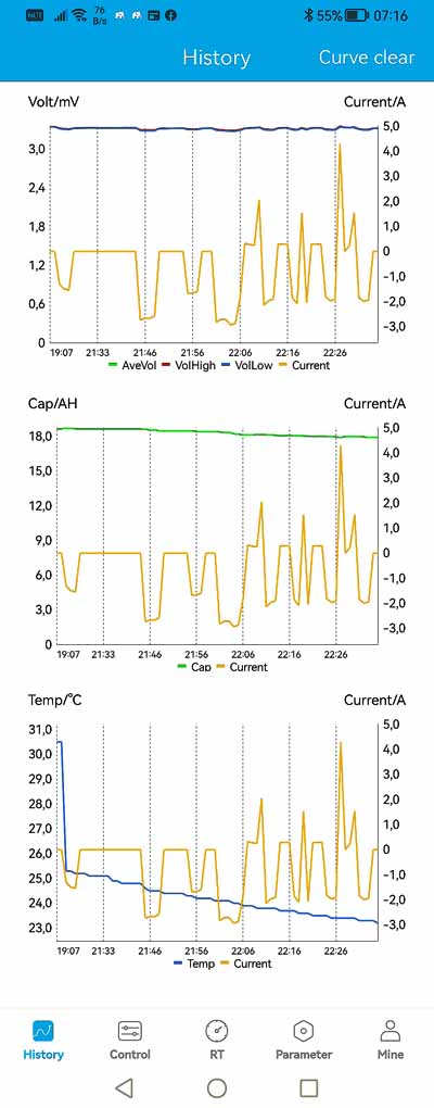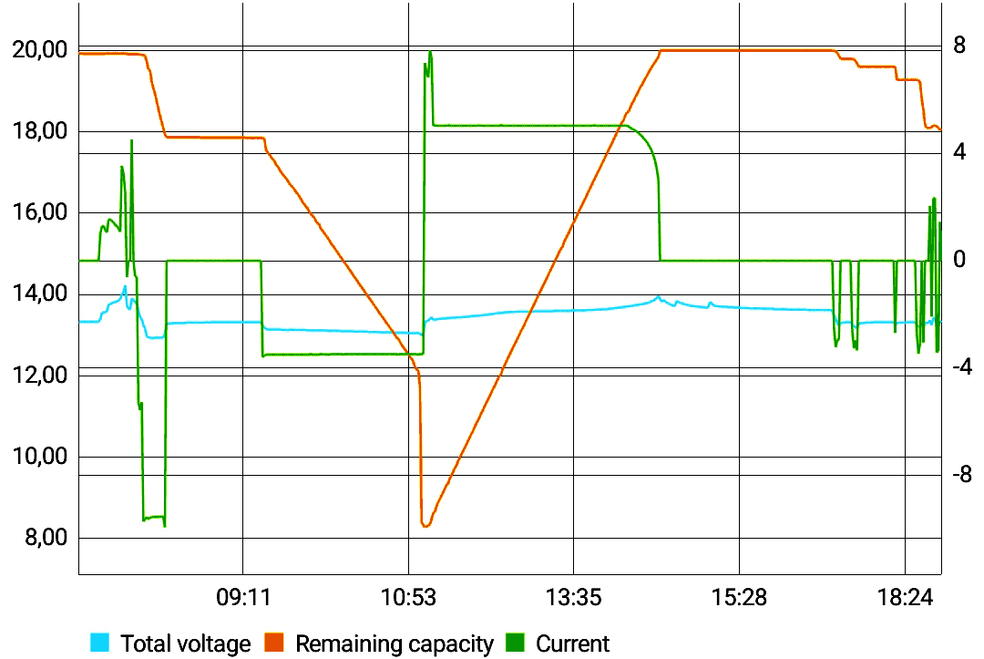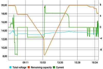 Si vous cliquez (par hasard) sur l'indication du courant, vous verrez apparaitre un graphique qui montre la tension totale de l'accu (en cyan), la charge (en orange) et le courant (en vert). Les données pour établir le graphique sont stockées sur le téléphone: quand il n'y a pas de communication, les données sont perdues. Si pendant ce temps la batterie est chargée ou déchargée, on voit alors un brusque saut de la capacité restante. Il n'y avait pas de communication entre le smartphone et la batterie entre 11 heures et midi: la capacité restante a fait un saut brusque.
