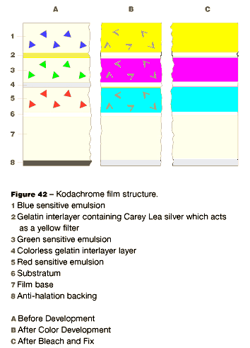 A droite les couches d'une émulsion Kodachrome: les couches ne diffèrent pas fondamentalement des couches d'un autre type d'émulsion car pour reproduire le mieux possible une scène colorée, il faut utiliser la synthèse soustractive. Le Kodachrome diffère dans la composition chimique des couches (et la procédure de développement), mais au final ce sont les mêmes couleurs qui apparaissent: le jaune, le magenta et le cyan.