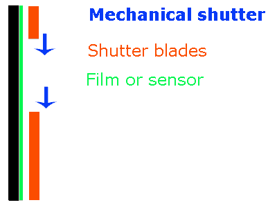 L'obturateur à rideaux fonctionne... bin comme deux rideaux: le premier s'ouvre et la lumière peut frapper l'émulsion, puis le second rideau se ferme et termine l'exposition. Comme les rideaux se déplacent à exactement la même vitesse, chaque partie de l'émulsion est exposée pendant un temps identique. Les caractéristiques et les particularités de l'obturateur à rideaux sont expliquées sur la page mentionnée ci-dessus.