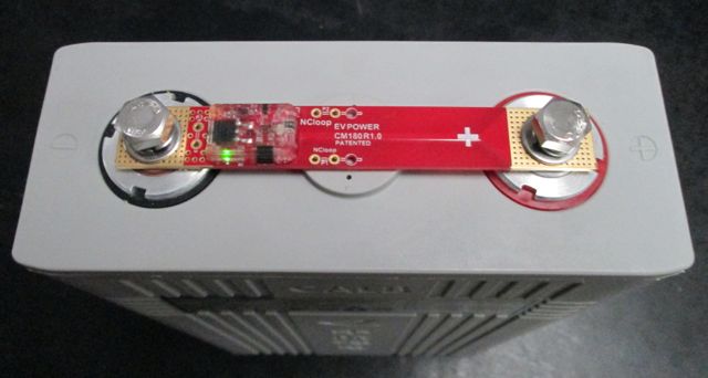 Rechts de egalisatiemodule voor één enkele cel voor een batterij van 100Ah. De module wordt bovenaan de cel geplaatst. De egalisatiestroom bedraagt maximaal 400mA à 1A naargelang de uitvoering. De module dient enkel voor de balancering, een BMS module is nog steeds nodig (bewaking van de celspanningen en temperatuur).