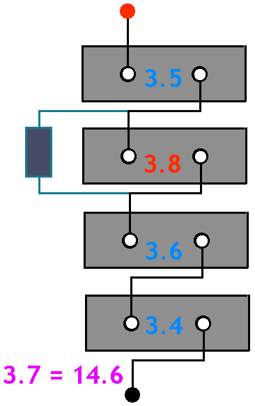 Het voorbeeld rechts is een eenvoudig voorbeeld, alle cellen hebben zo'n weerstand die in gebruik genomen kan worden indien nodig. De tekening toont een spanning van 3.8V die te hoog is (alsof de weerstand niet zou werken).