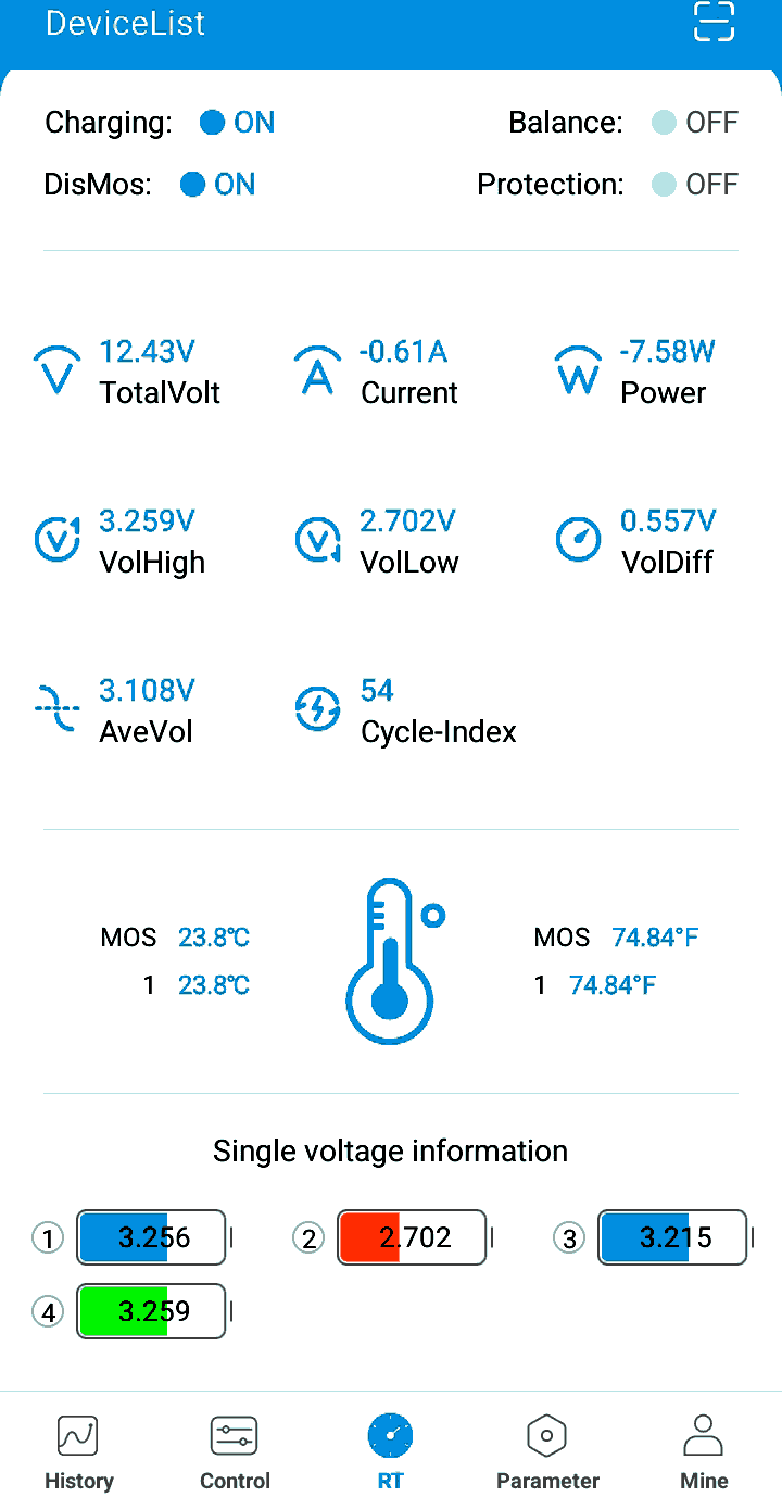 Een egalisatie moet ongeveer om de 10 cycli gebeuren. De egalisatie zal sneller gedaan zijn als die regelmatig herhaald wordt, want de nodige correctie is dan beperkter. Bepaalde apps zoals Xiaoxiang geven de spanning van ieder cel weer, bij een andere app krijg je enkel de totale spanning te zien en moet je hopen dat de egalisatie correct verlopen is. Na een lading met egalisatie moeten de spanningen van ieder element nagenoeg gelijk zijn.