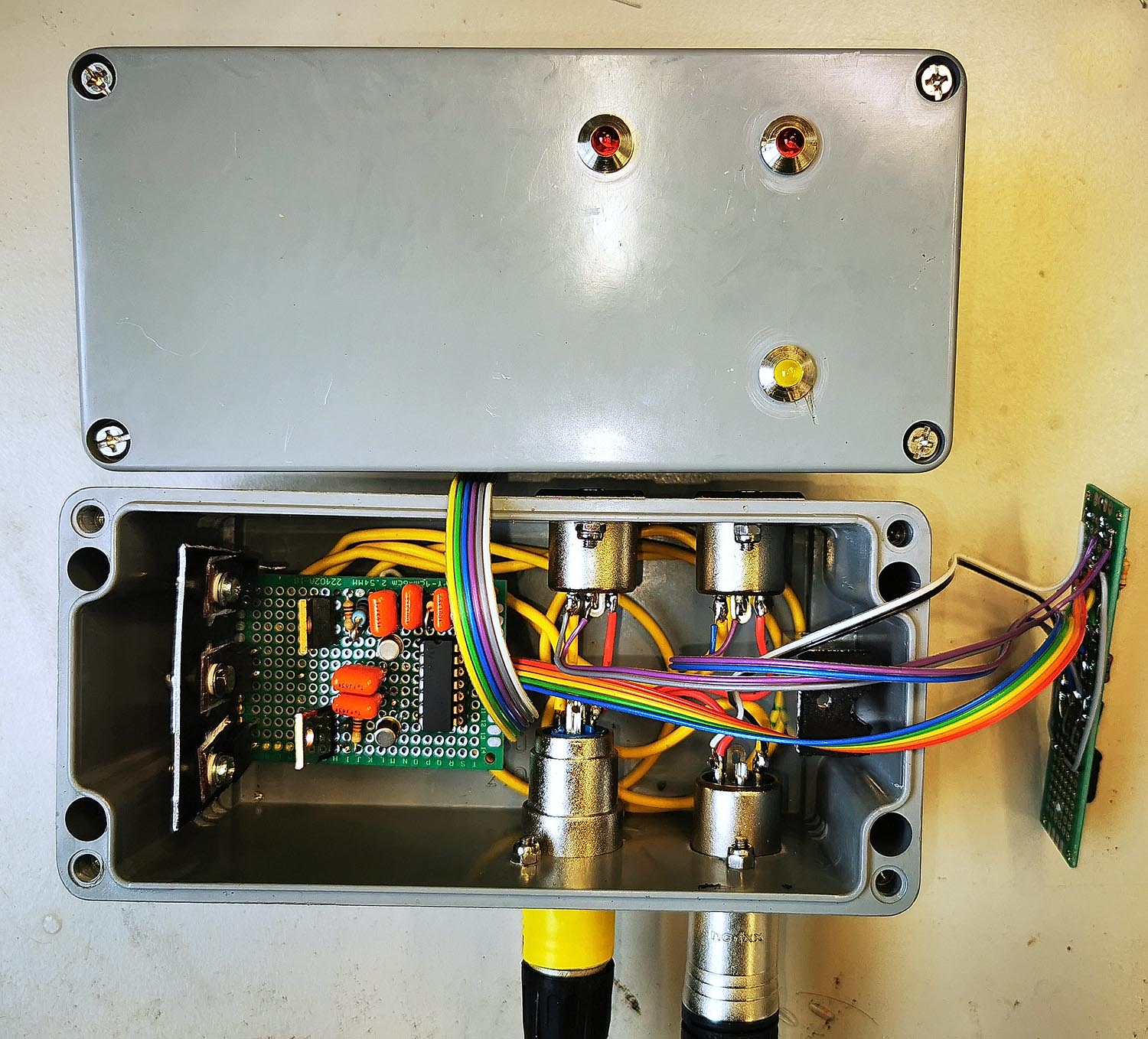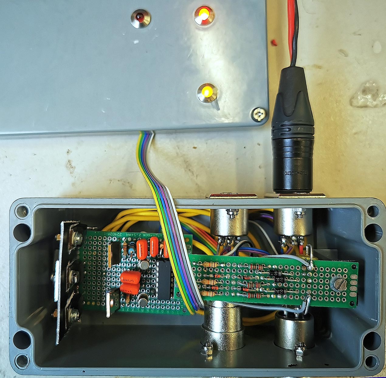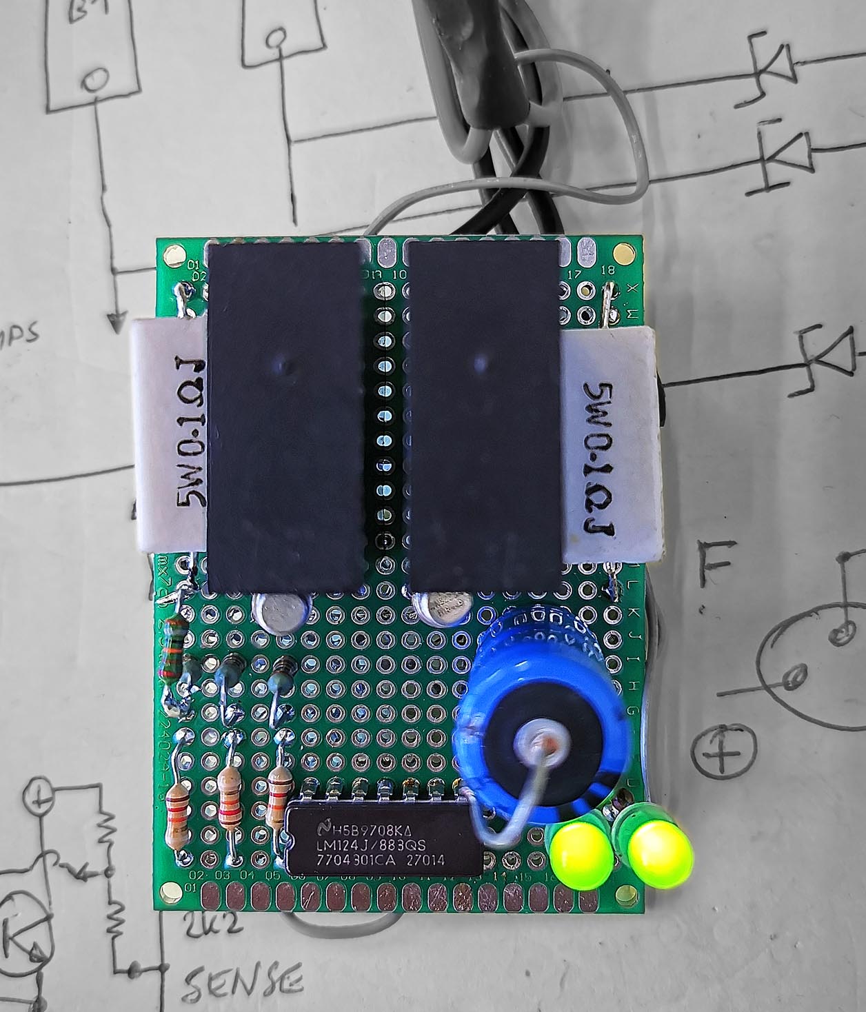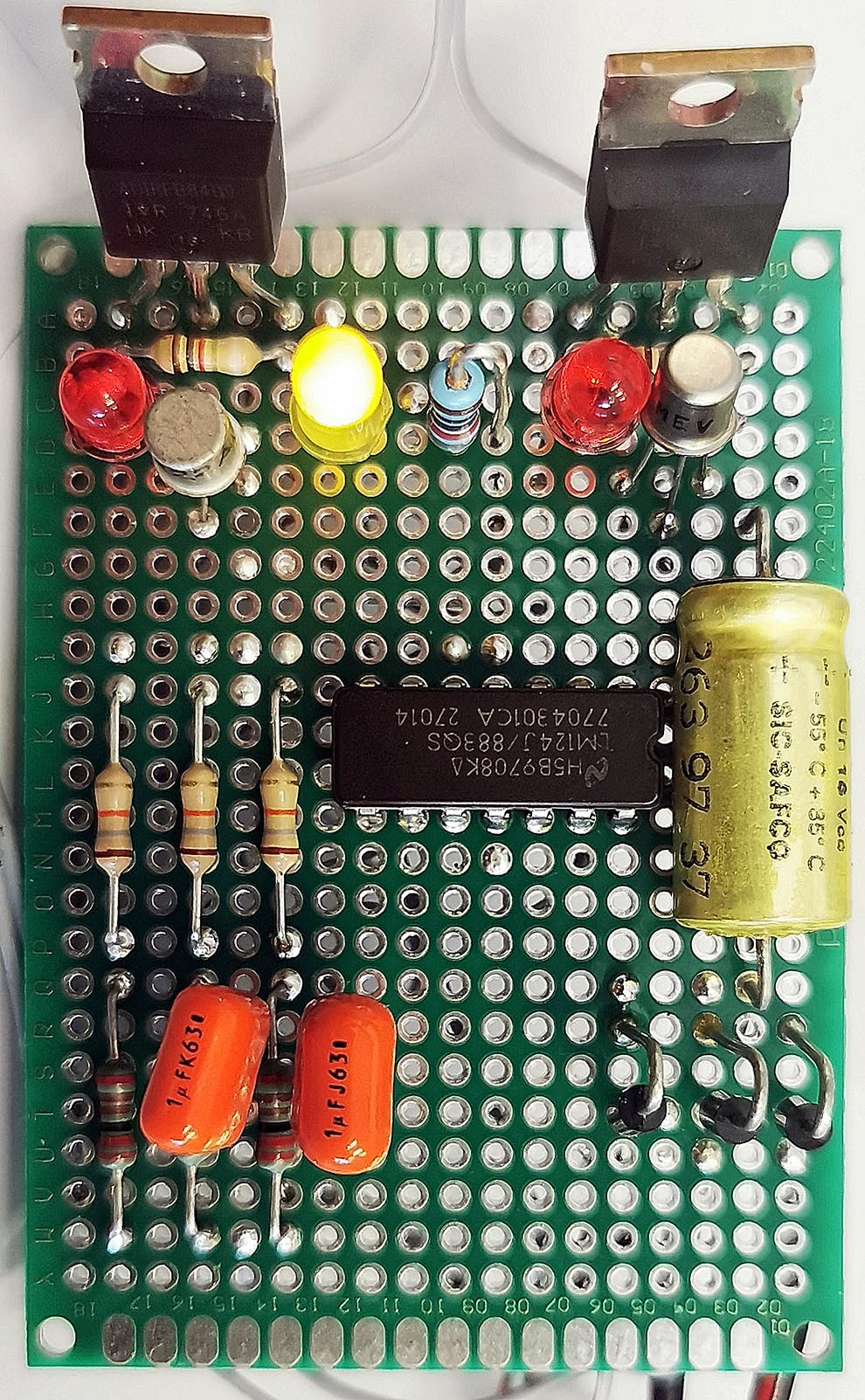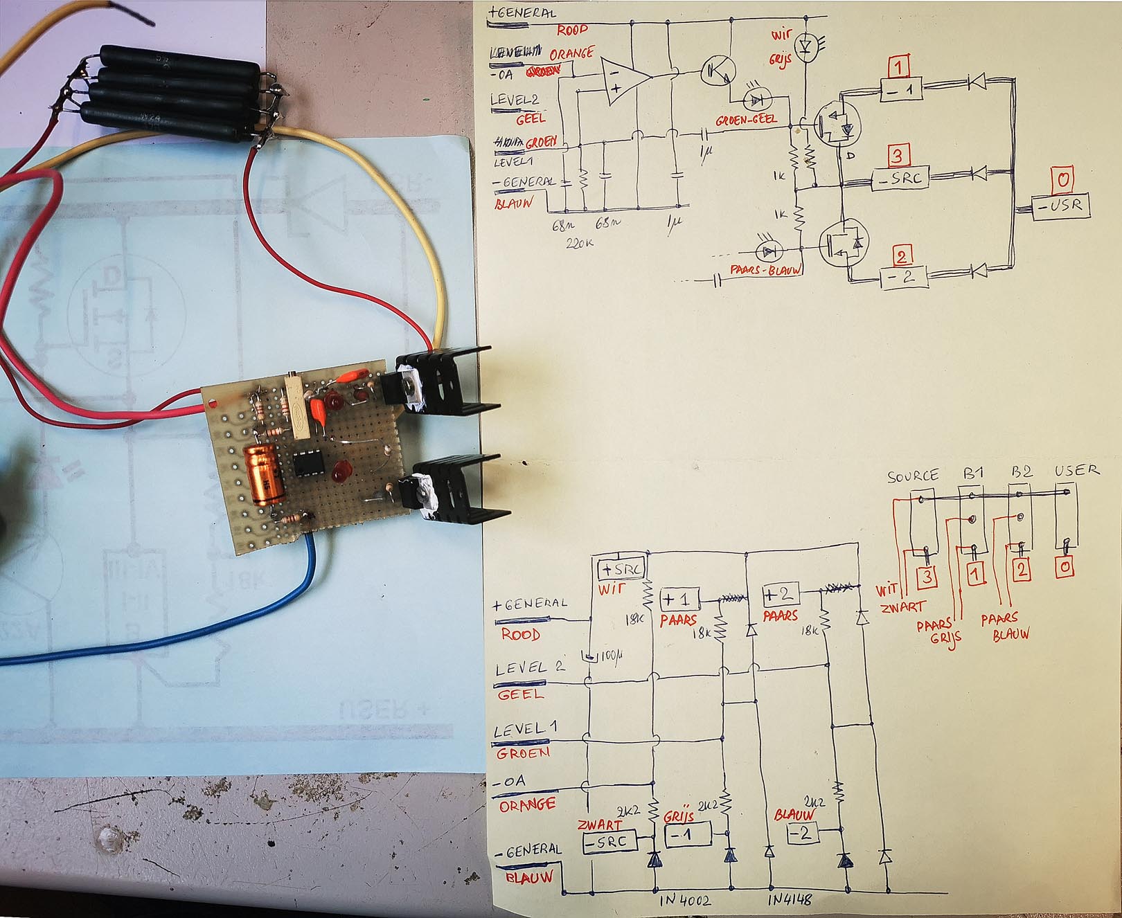 De gele led geeft aan dat er spanning aanwezig is (van de auto), de rode led geeft aan dat de betreffende batterij geladen wordt. De schakeling komt overeen met de schakeling hier boven, maar voorzien voor twee batterijen en met kleine condensatoren aan de ingang van de op amps (10nF).