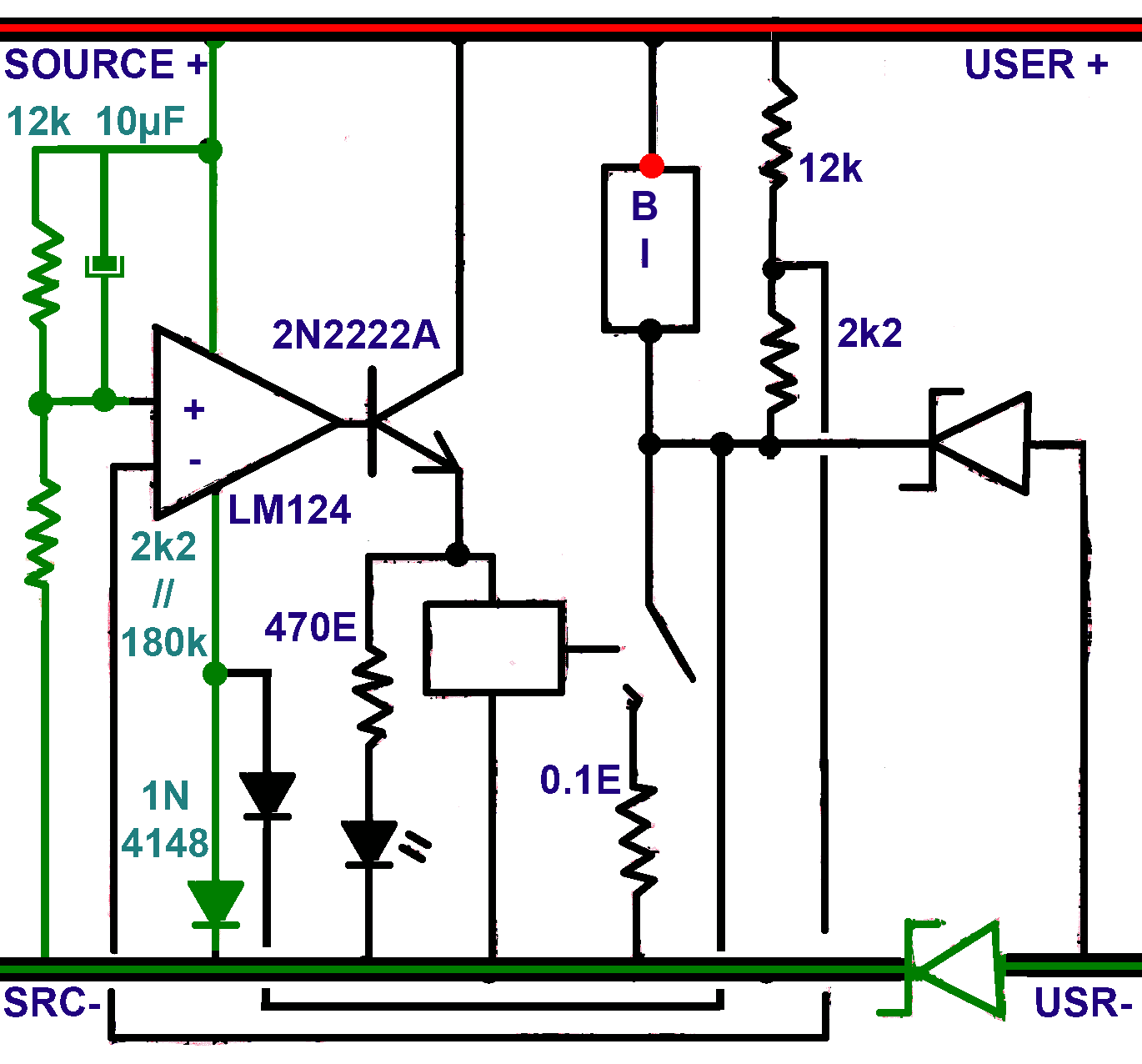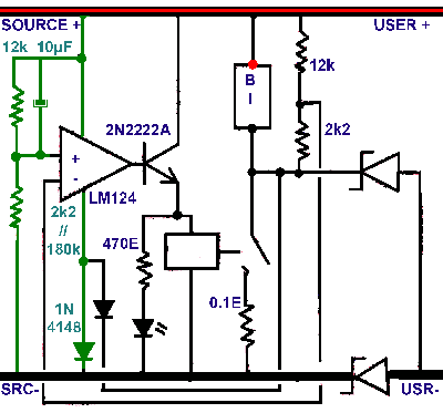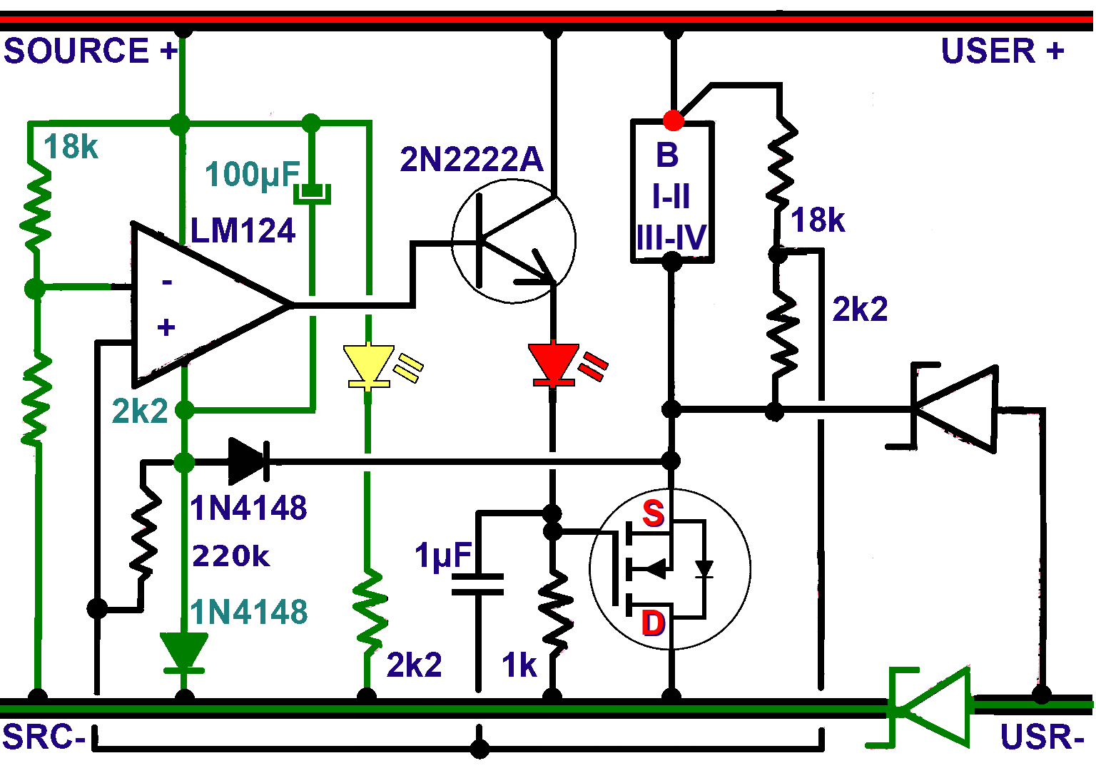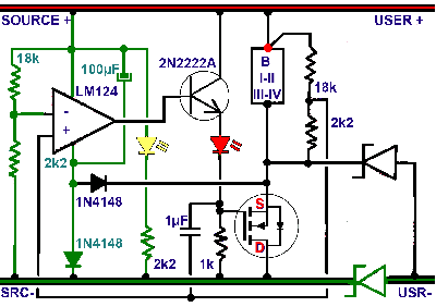 De gebruikte op amp, een LM124 maakt het mogelijk om tot 4 secundaire batterijen te gebruiken. Het gemeenschappelijk deel van de schakeling is in het groen.