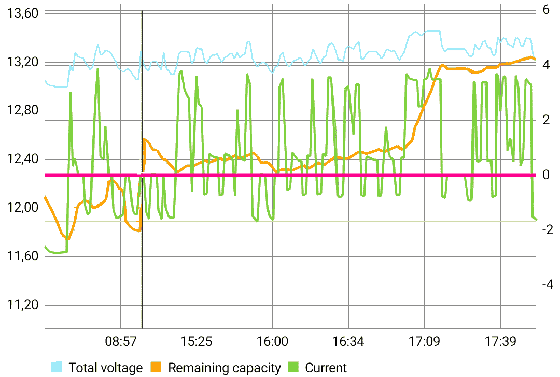 De laadstroom bedraagt nu maximaal 3.9A (terwijl die vroeger met enkel schottky diodes ongeveer 0.5A bedroeg bij warm weer). De ontlaadstroom bedraagt ongeveer 2A als de motor niet draait en -0.6A als de motor draait. Gedurende een deel van de rit was er geen meting (9 tot 15 uur).