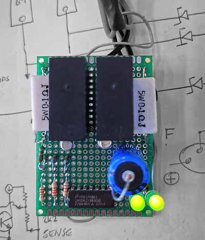Links een eerste prototype met dummy load, rechts de uiteindelijke schakeling met de vermogensleidingen en de extra beveiligingen.