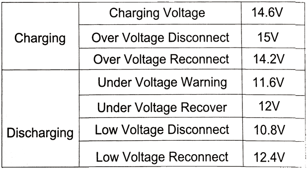 Dit zijn de schakelniveau's van de LFT accu's. Deze waardes zijn van toepassing op nagenoeg alle accus van het type LFP. De accu wordt van het net ontkoppeld als de spanning boven de "Disconnect" waarde komt. Er is een grote dode zone om te vermijden dat de accu constant in- en uigeschakeld zou worden. DE doze zone bij het laden is 0.8V groot en bij ontlading 1.6V. Met zo'n grote zone wordt vermeden dat de accu permanent op zijn extremen werkt, daar waar hij sneller kan verslijten. De accu moet een beetje geladen worden vooraleer die opnieuw ontladen kan worden.