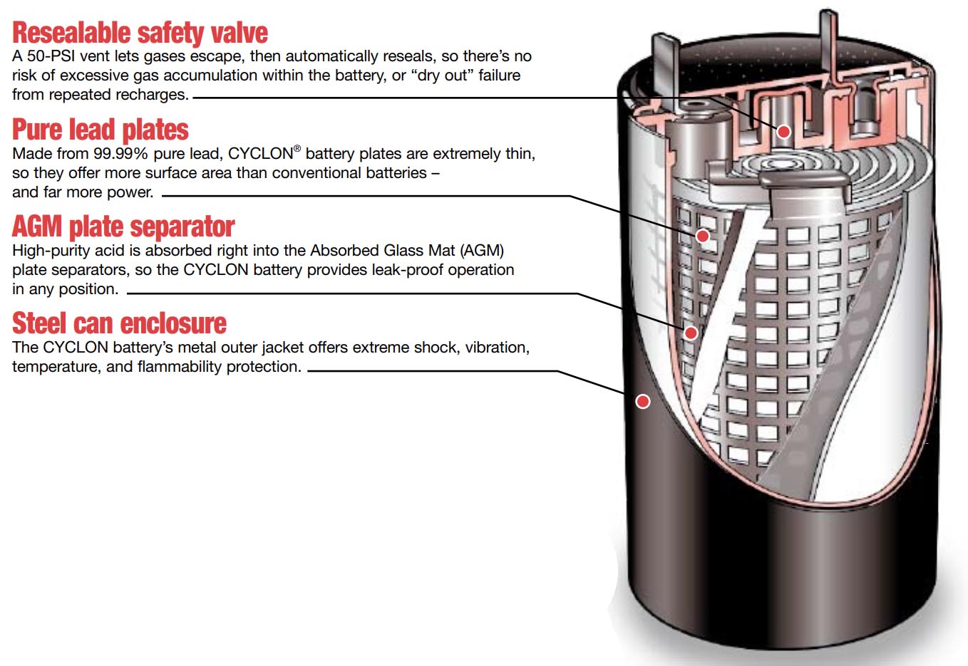 Het materiaal van de electroden wordt beter op zijn plaats vastgehouden in vergelijking met rechthoekige cellen. De cylindervormige cellen zetten de platen onder druk zodat er geen plaatmateriaal kan loskomen.