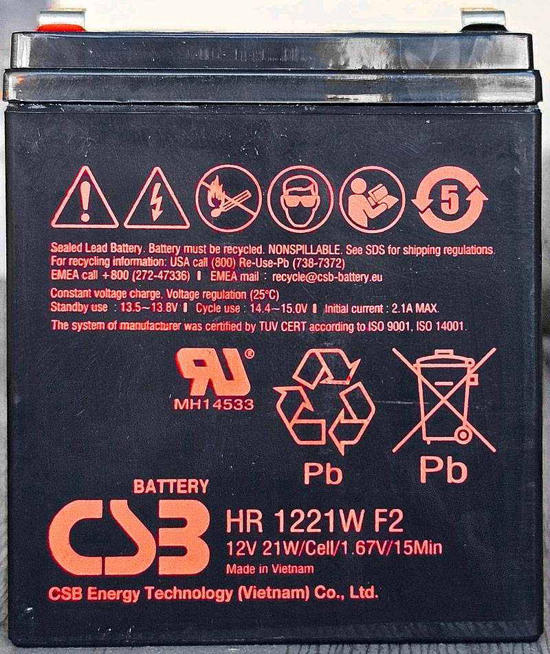 Niet alle accu's kunnen een dergelijke stroom leveren: bij het vervangen van de accu's moet men specifiek uitkijken voor accu's met de vermelding "UPS", een aanduiding van de maximale stroom of een accu waarbij een ontlaadtijd vermeld staat, zoals hier: ontladen in 15 minuten tot een spanning van 1.67V per cel (dus 10V voor een accu van 12V).