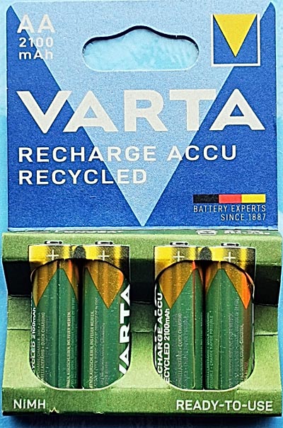 Rechts de nieuwe accu's van Varta, AA formaat "ready to use", die zeer goed presteren in de verschillende tests.