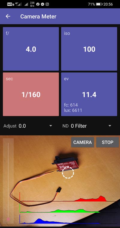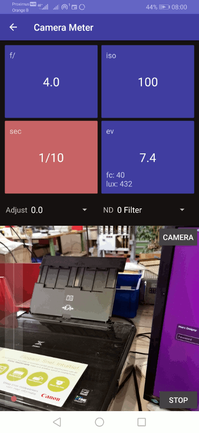 Men kan een waarde gebruiken als variabele (opening, ISO waarde of sluitertijd) door de funktie langer aan te raken. Als het omgevingslicht gewijzigd wordt, wordt de geselecteerde variabele in real time aangepast. Je kan natuurlijk ook de andere parameters manueel blijven veranderen en de variabele wordt automatisch aangepast. De software lichtmeter is in vele opzichten gemakkelijker te gebruiken dan een klassieke lichtmeter.