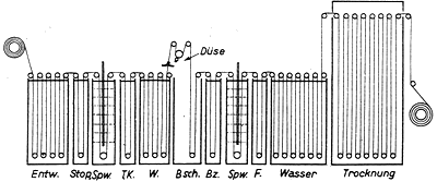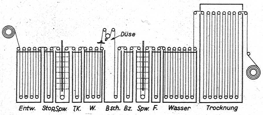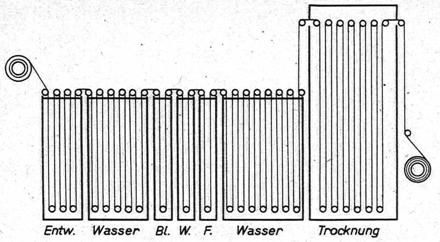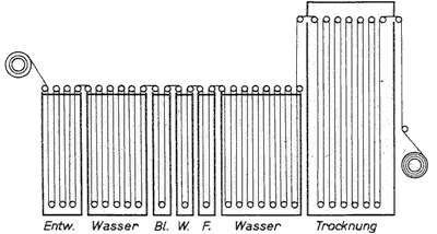 We hebben de ontwikkeling met vorming van de kleurstoffen, het bleken, het fixeren en het drogen, met tussen iedere stap een spoelbad.