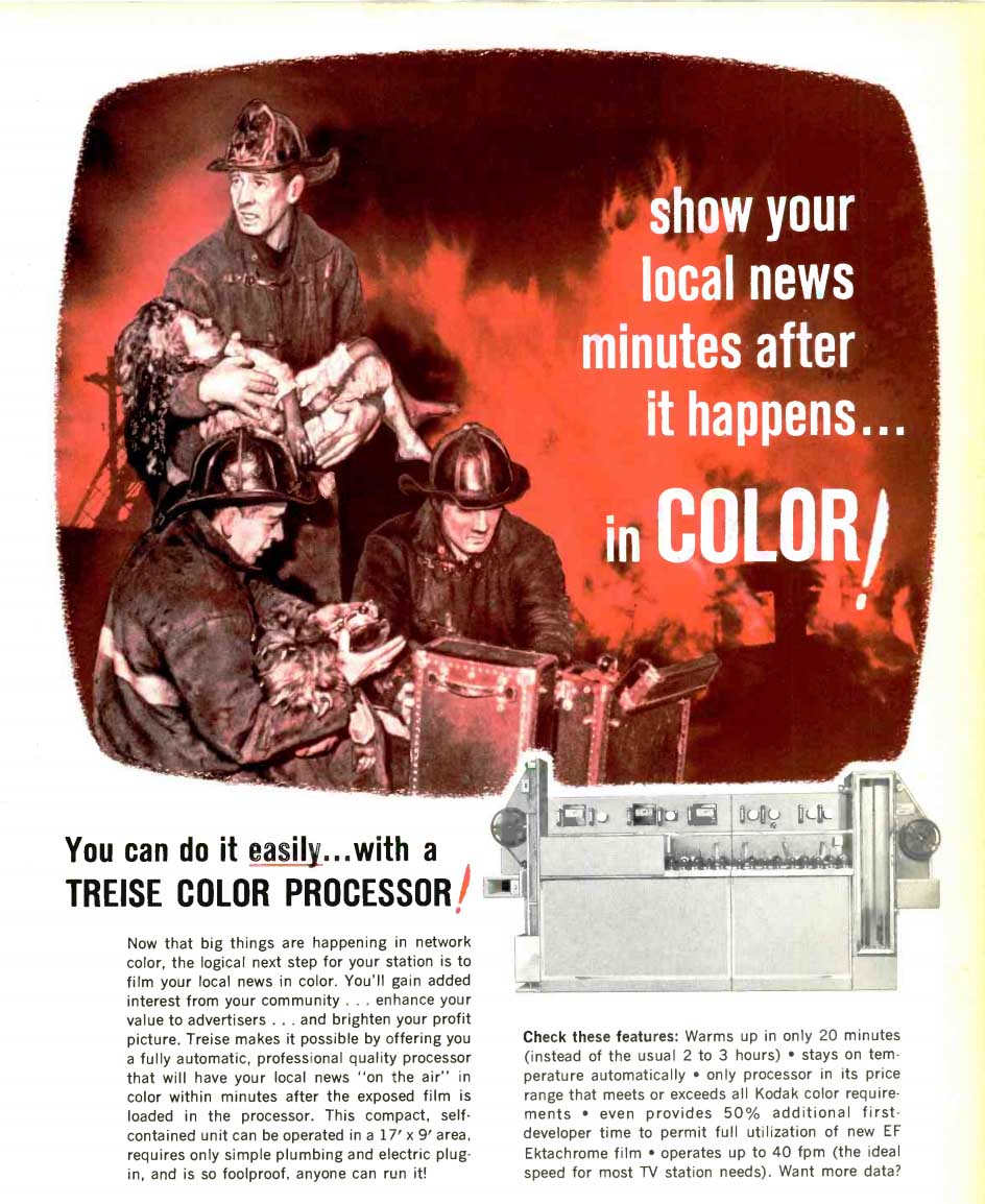 Rechts een ontwikkelmachine die gebruikt werd door ENG ploegen avant-la-lettre. De ontwikkelde film kon natuurlijk niet ter plaatse uitgezonden worden, maar moest naar de studio gebracht worden. Testen om de beelden via een telefoonlijn te versturen liepen op niets uit met de technologie uit die tijd (300 baud). Om een televisielijn te versturen via de telefoon had je bijna 2 seconden nodig, en een beeld had 525 (bruikbare) lijnen. Je had dus 15 minuten nodig per beeld dat je wou versturen.
