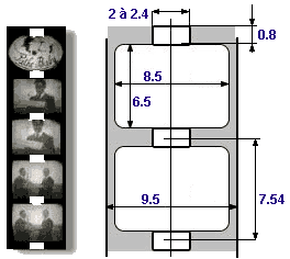 Het 9.5mm filmformaat werd gekenmerkt door perforaties tussen de beelden en een inkeping om de film gedurende 10 seconden te stoppen