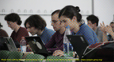 Een ander effekt is dat we de kleuren niet goed zien. Onze hersenen zijn niet in staat alle informatie te verwerken en moet daarom de kantjes eraf lopen. Zo wordt een zwart-wit afbeelding in kleur waargenomen, door de gekleurde stippen die over het beeld gesuperponeerd worden. Zie de foto rechts: het is wel degelijk een zwart-witte foto waarop gekleurde stippen geplaatst werden. De gekleurde stippen zijn onvoldoende zichtbaar om direct waargenomen te worden (je ziet de stippen wel na een paar seconden als de hersenen de tijd hebben gehad om het volledig beeld te analyseren). Maar onze hersenen zien direct dat er kleur aanwezig is en plakken de betreffende kleur op het volledig onderwerp (gezichten, kleding, enz).