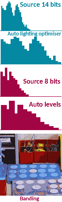 De funktie komt wat overeen met de [SHIFT][CONTROL][L] van fotosoep (auto levels), maar de omzetting gebeurt op het raw beeld van de camera. Bij auto lighting optimiser wordt er met het bronbestand gewerkt (14 bits), waardoor banding minder zichtbaar is op het resultaat in 8 bits. Indien de bewerking gebeurt op het 8 bit bestand, dan worden de beschikbare niveaus uitgespreid, waardoor er banding optreedt (rode histogram). De foto als voorbeeld heeft een extreme banding, zo erg is het normaal niet in de werkelijkheid.