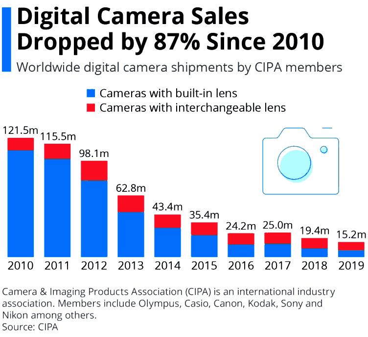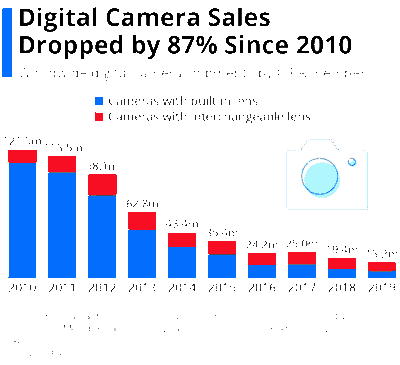 Het verkoop van fototoestellen is in dalende lijn sinds 2010. De markt van de toestellen met verwisselbare lenzen blijft redelijk stabiel, maar die van de compacte en bridge toestellen is volledig ingestort. Waarom zou je immers een fototoestel kopen, als de smartphone ook foto's kan nemen?